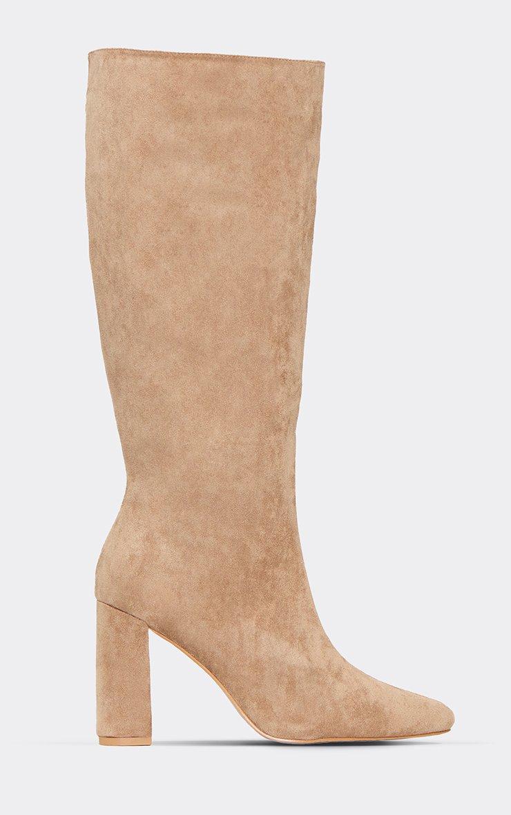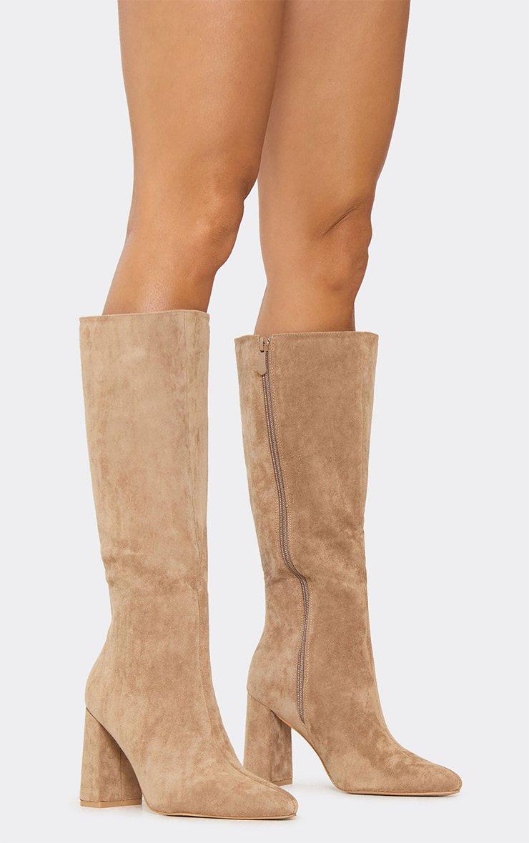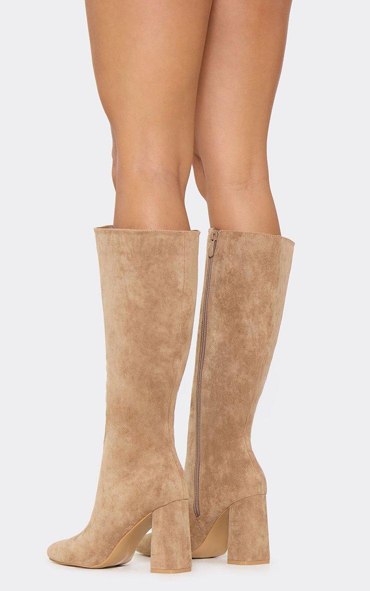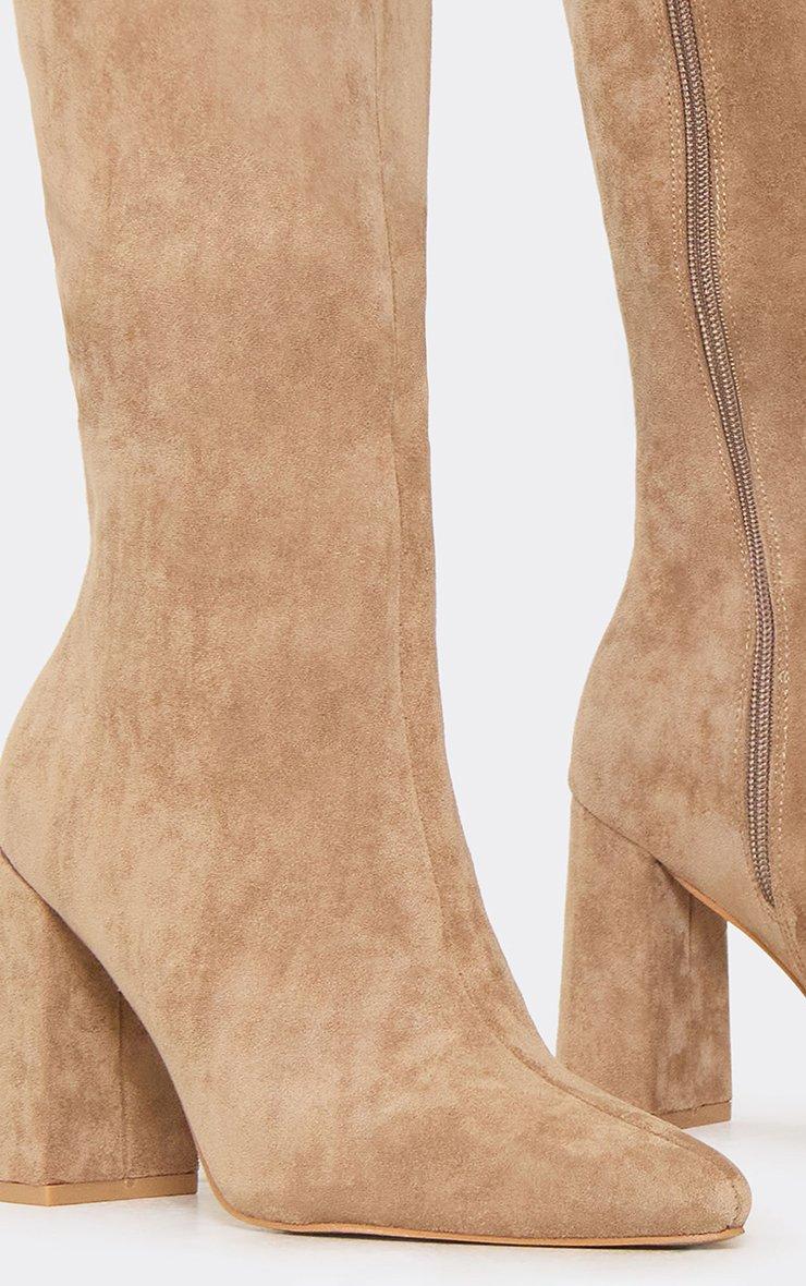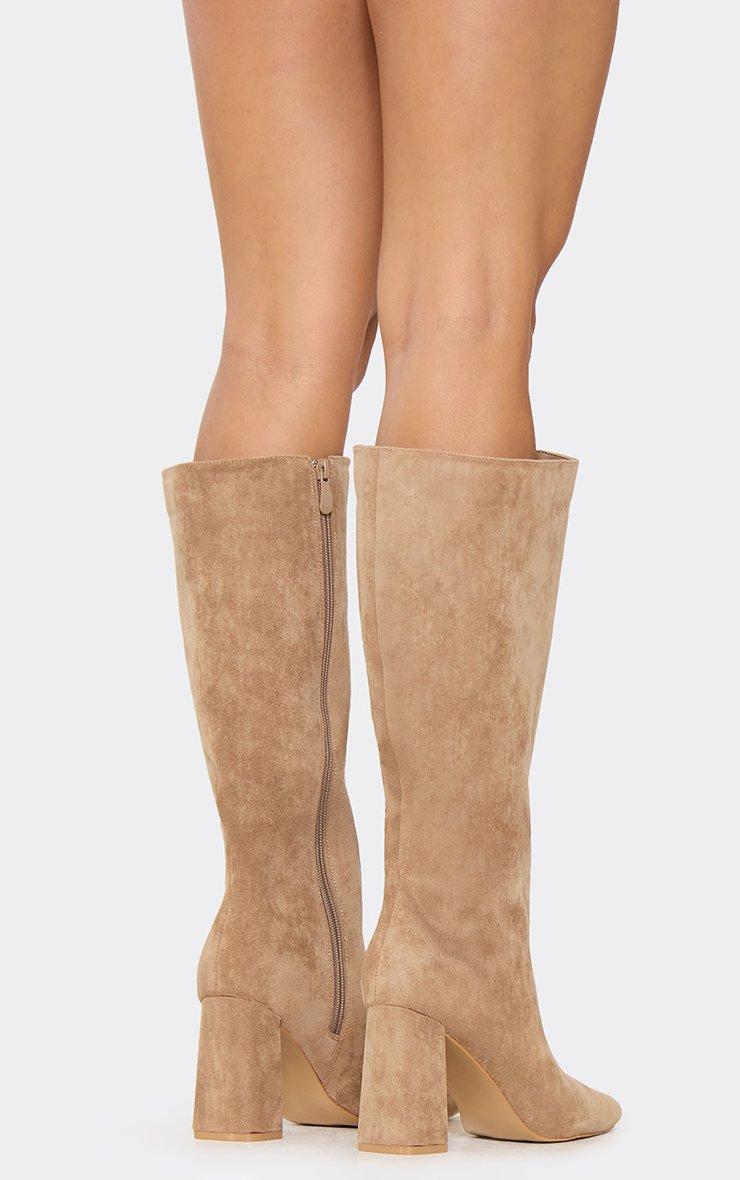 Sandi Pointed Toe Knee High Block Heel Boot In Beige Faux Suede