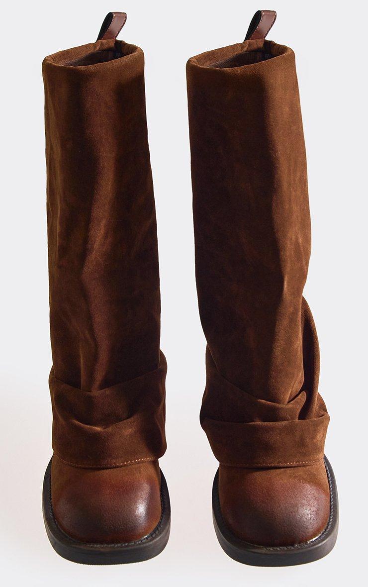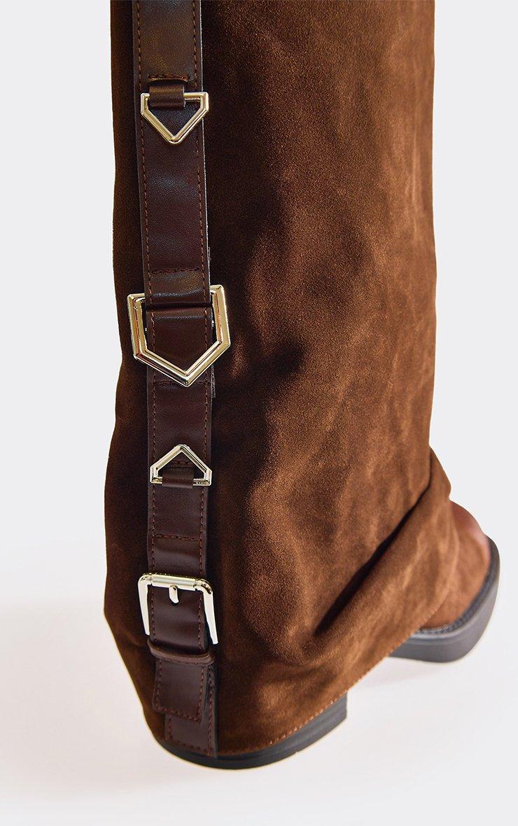 Situationship Block Heel Buckle Detail Layered Mid Calf Boot In Brown Faux Suede
