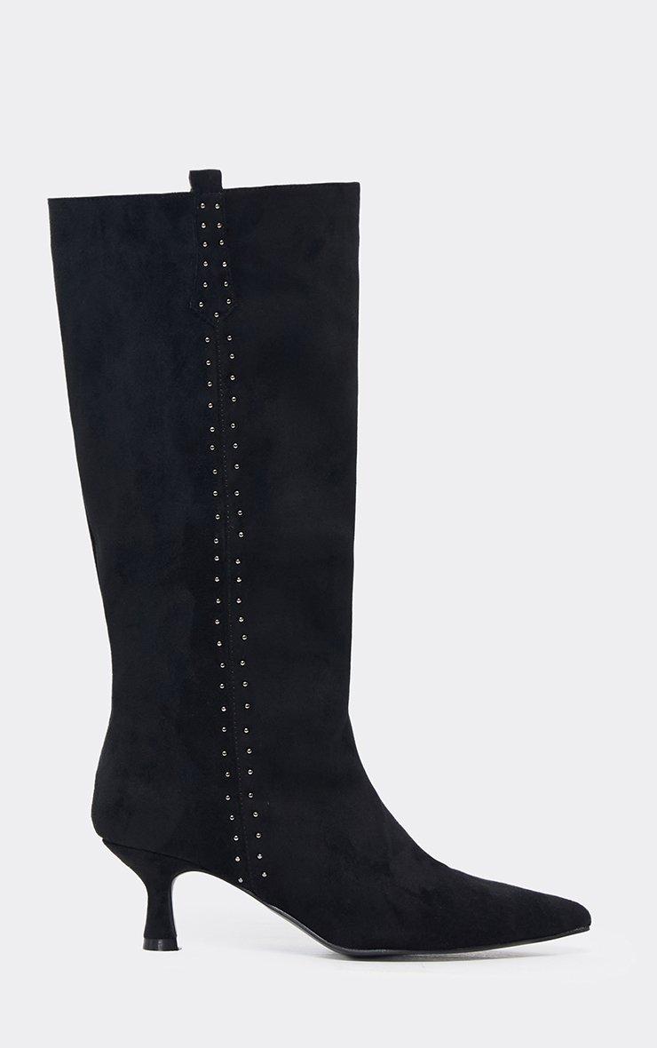 Charter Stud Detail Pointed Toe Knee High Boot In Black Faux Suede