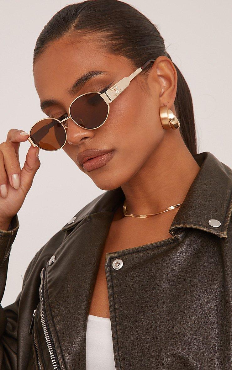 Oval Cateye Shape Side Detail Brown Tinted Lense Metal Frame Sunglasses In Gold