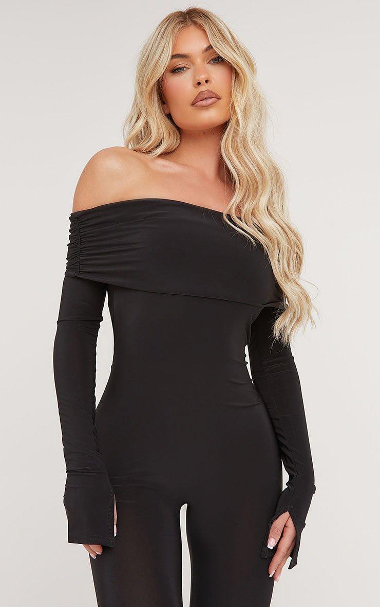 Add a luxe feel to you wardrobe with this jumpsuit doll. Featuring a black slinky material, a bardot neckline, an open back detailing and a split hem. Team this with some heels and accessories for a date night look we love.