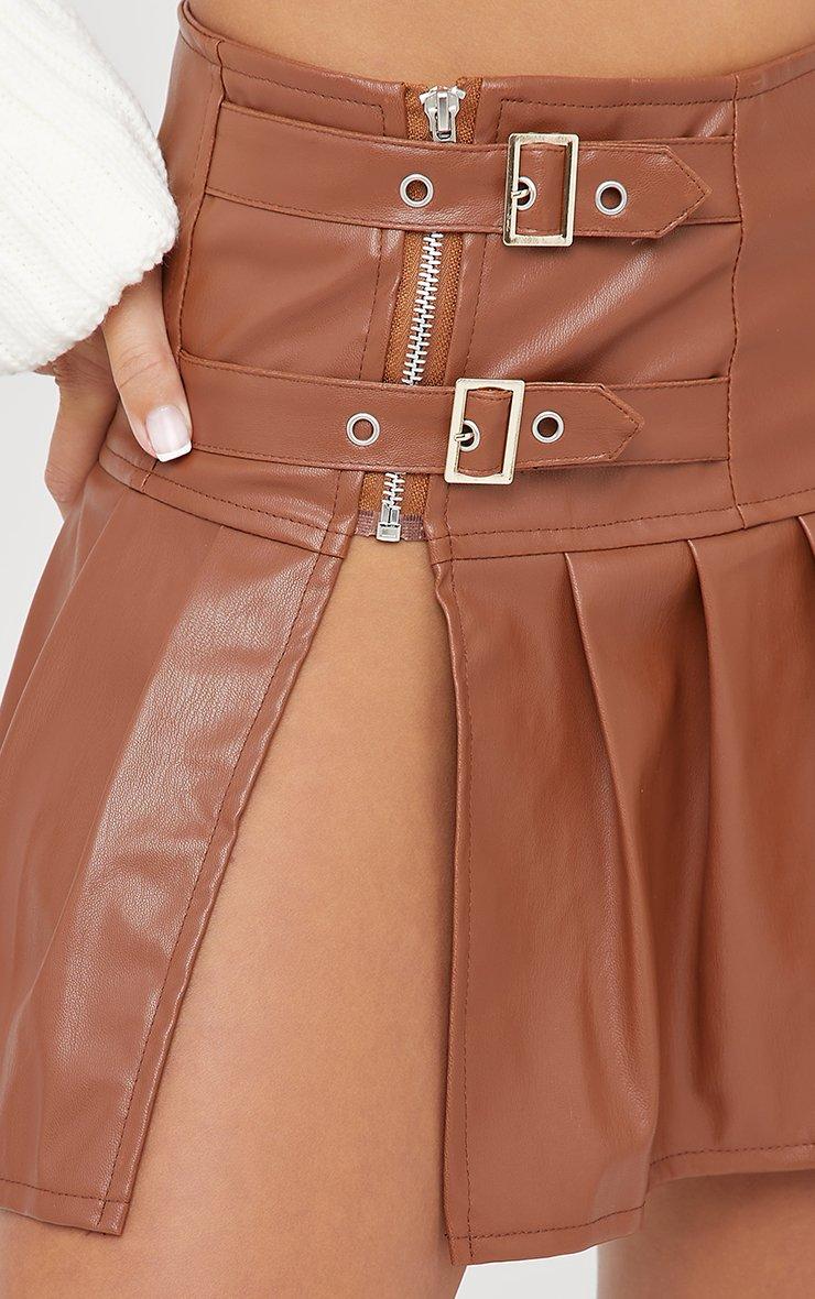 High Waist Buckle Strap Detail Pleated Mini Skirt In Brown Faux Leather