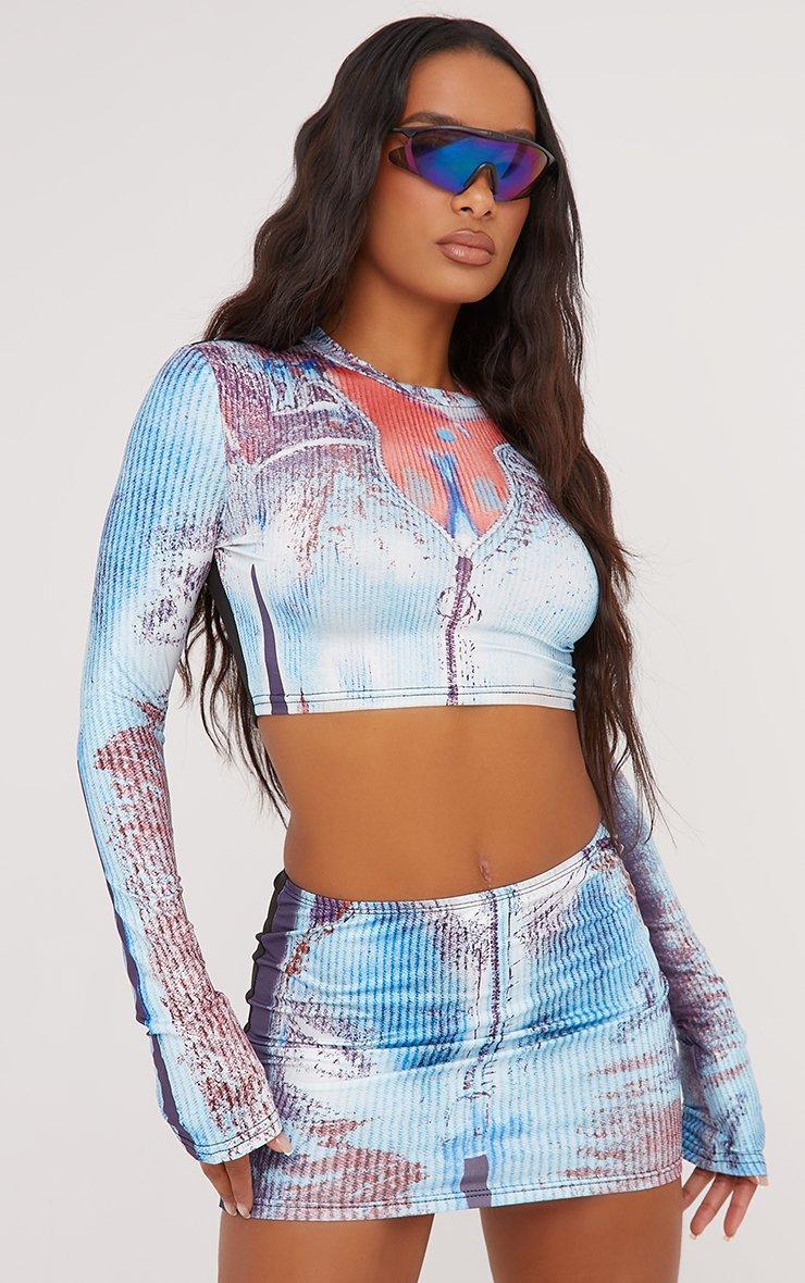 Long Sleeve Denim Print Crop Top And Mini Bodycon Skirt Co-Ord Set In Multi Slinky