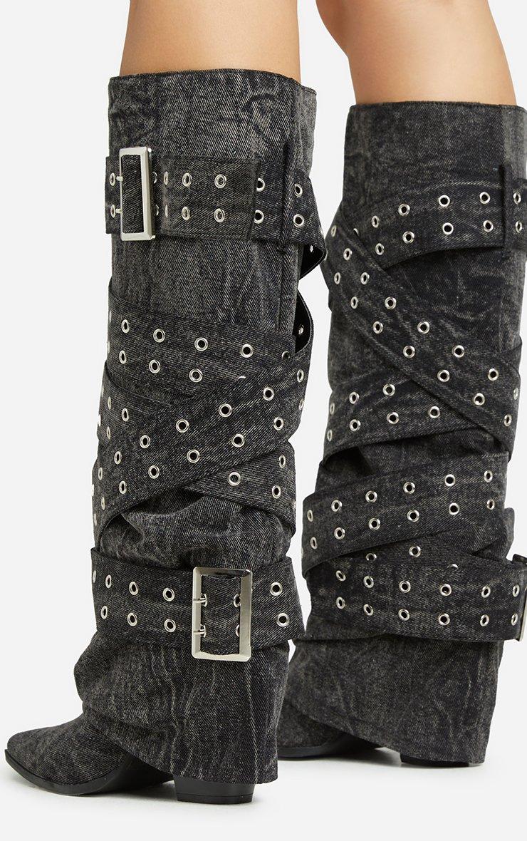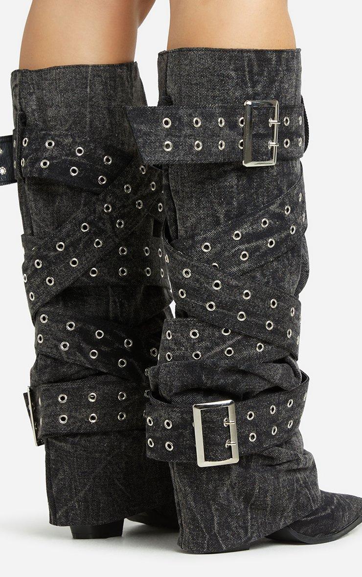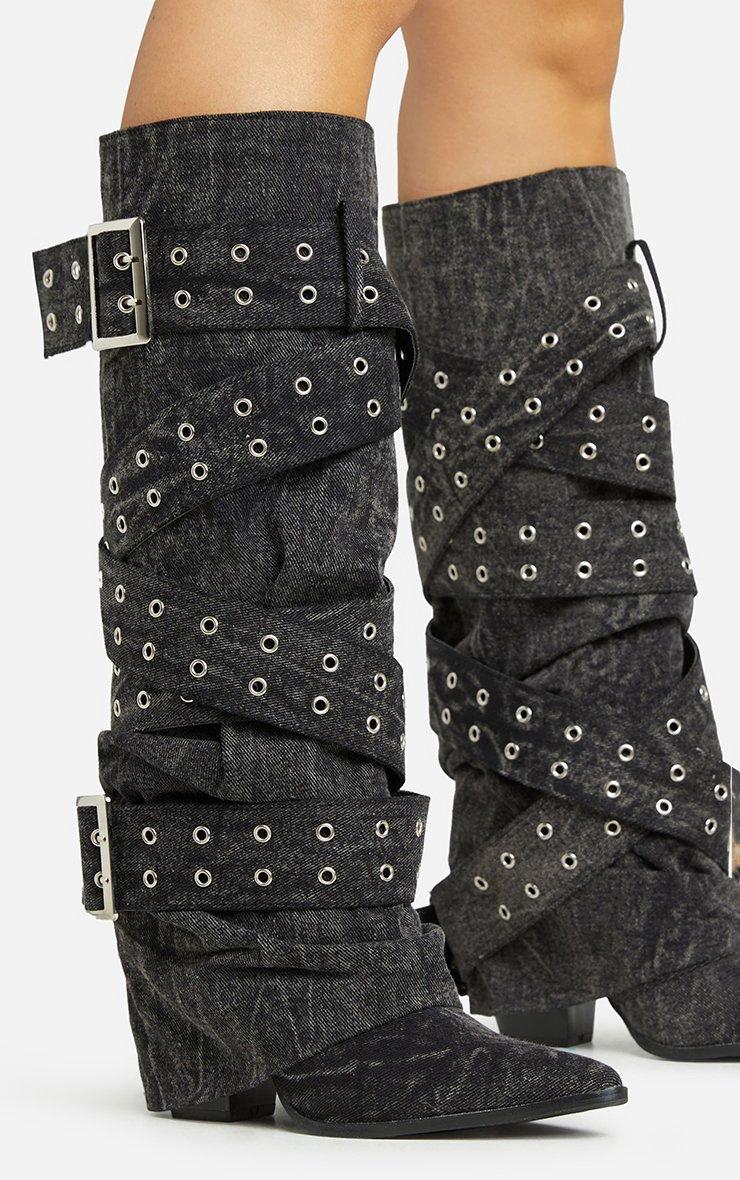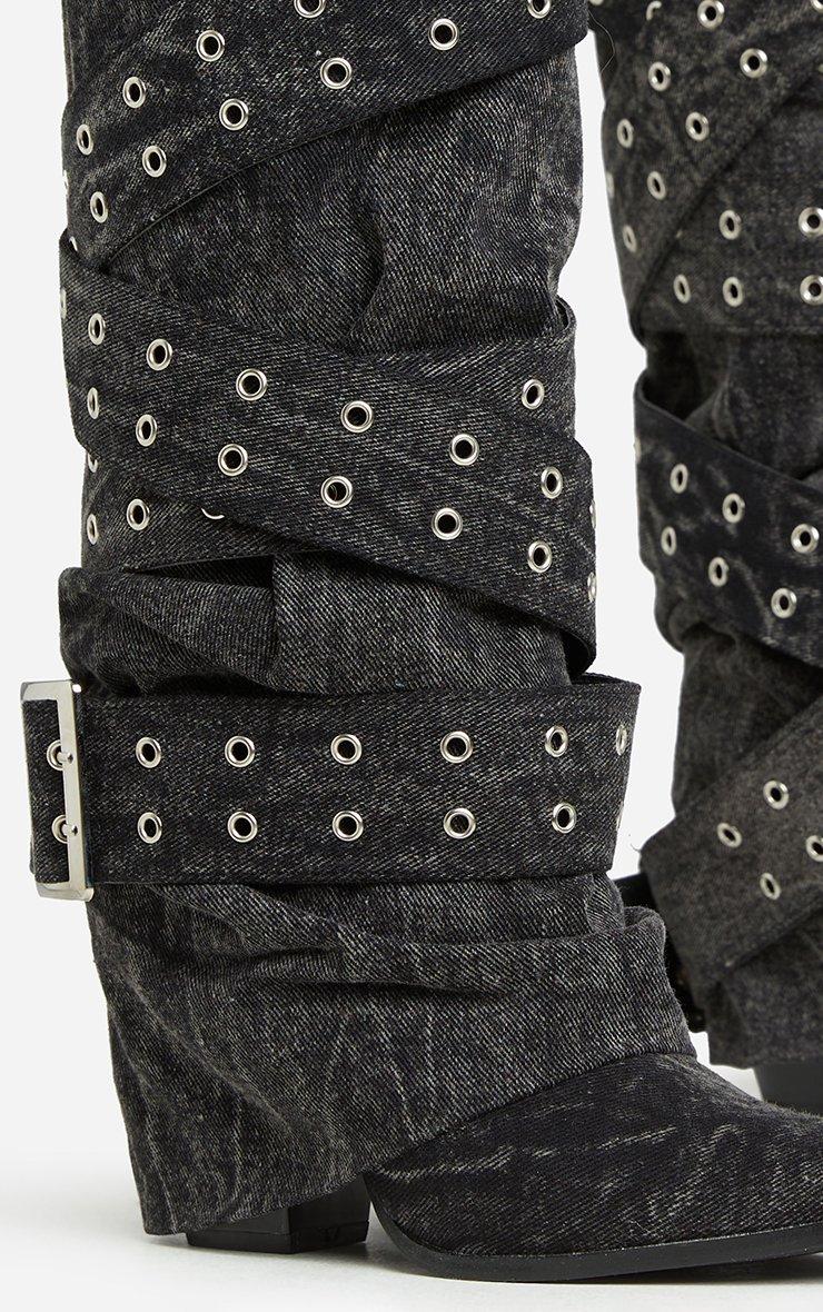 Add some texture to your date night look doll. Featuring a black denim material, with eyelet buckle strap detailing, a pointed toe, block heel and a knee high length.