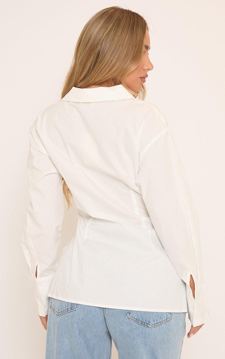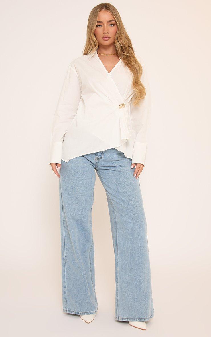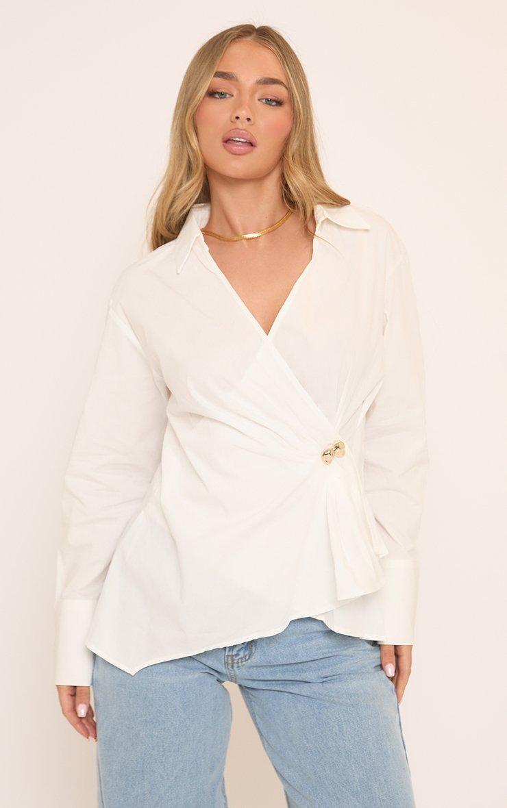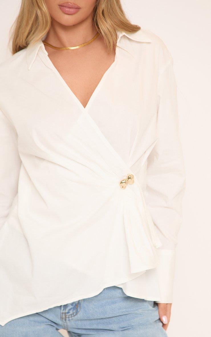 Long Sleeve Cross Over Front Button Detail Shirt In White Poplin