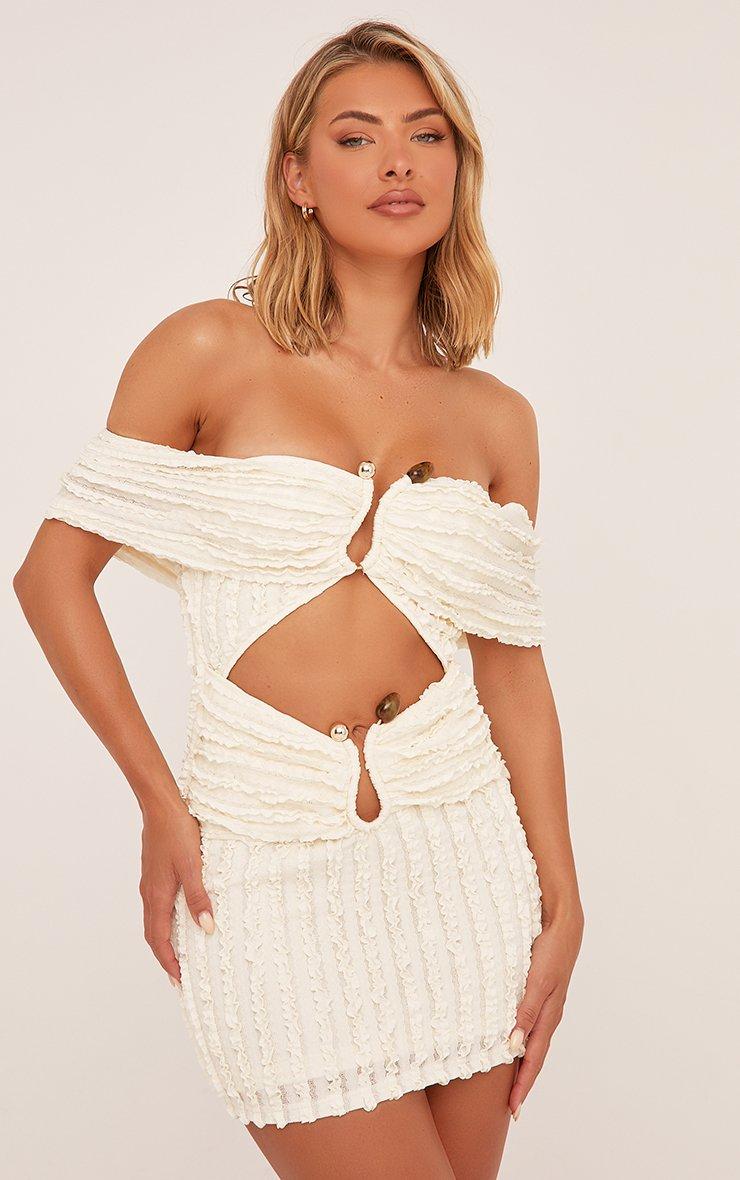 This dress is all about the details. Featuring a cream textured material, a bardot neck, gem details, a cut out, a bodycon fit and a mini length.
