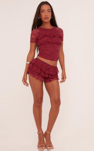 Keep it fierce in our Low Rise Tiered Frill Micro Shorts In Burgundy Lace. These burgundy lace shortsâ are an instant confidence boost with a sultry low rise fit and flirty tiered frill. Style these micro shorts with the matching top for a head-turning look!