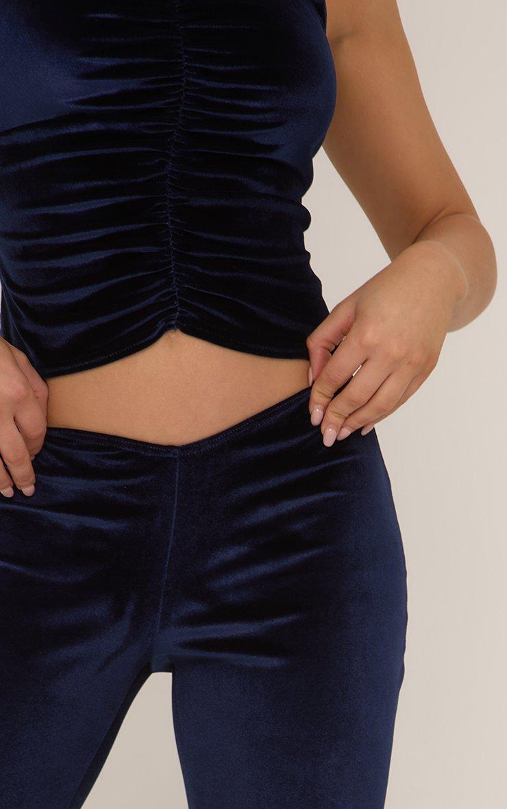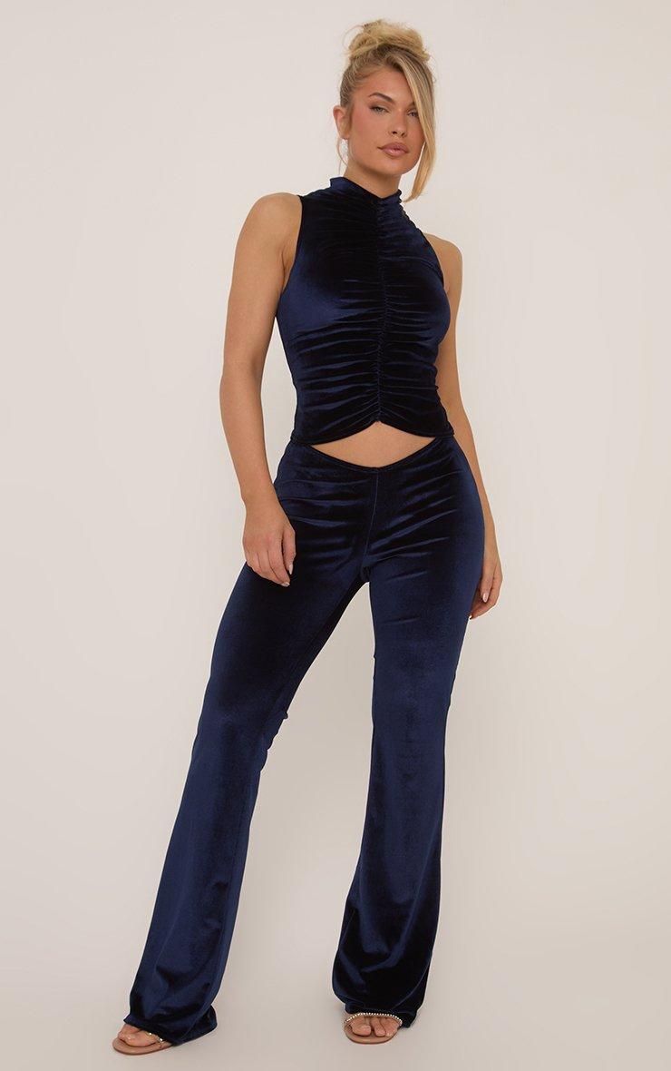 Low Rise Ruched Bum Flared Trousers In Navy Blue Velvet