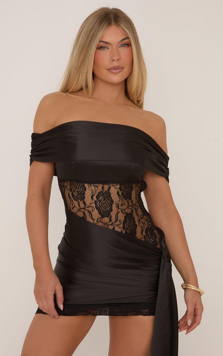 Doll, get ready to stun! Featuring black satin with a Bardot neckline and lace insert detailing, this mini dress drapes beautifully for that perfect blend of elegance and boldness.
