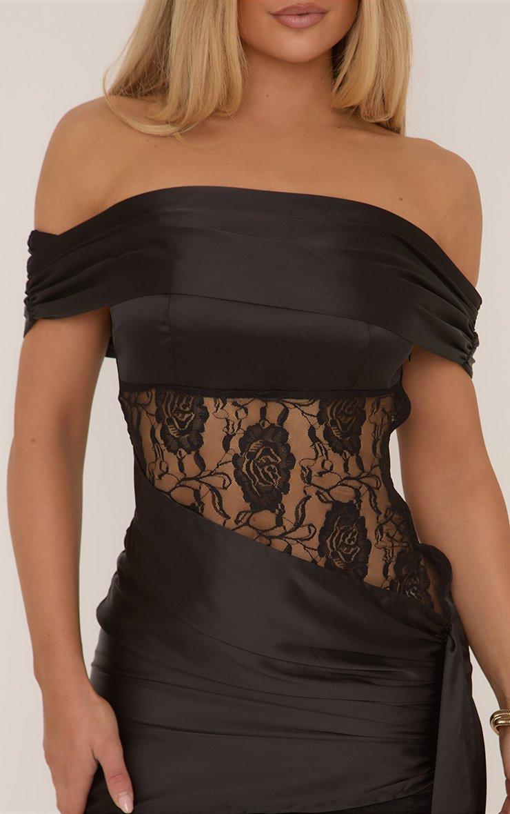 Satin Bardot Lace Insert Drape Detail Mini Dress In Black