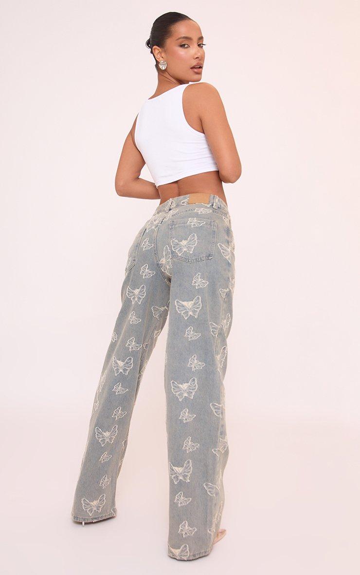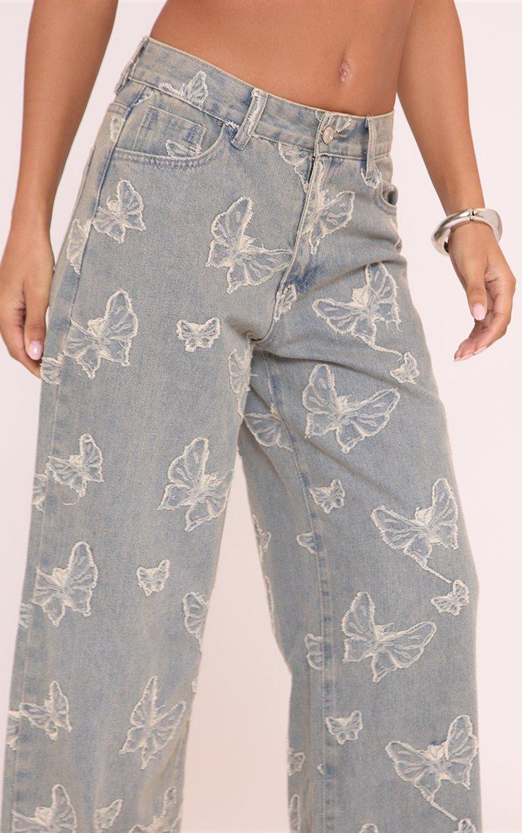High Waist Butterfly Distressed Detail Wide Leg Jeans In Blue Denim