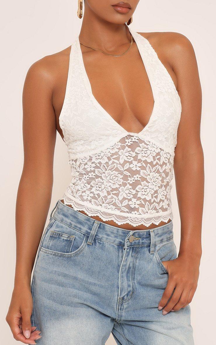 Halterneck Plunge Front Top In White Lace