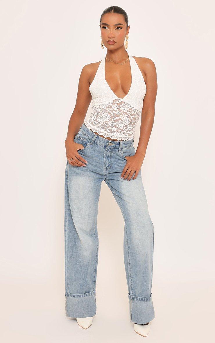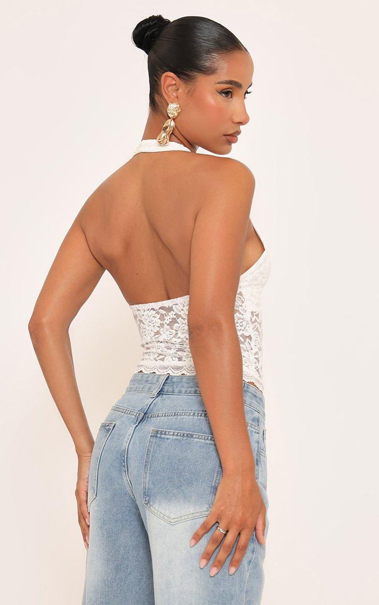 Date night, doll. Featuring delicate white lace with halterneck and plunge front detailing, this top serves chic, elegant vibes to keep your look fresh and fierce.