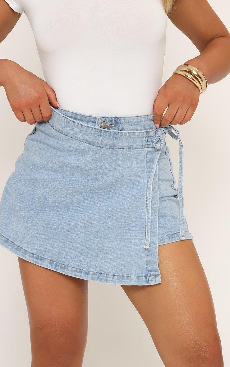 Wrap Over Tie Waist Skort In Light Blue Denim