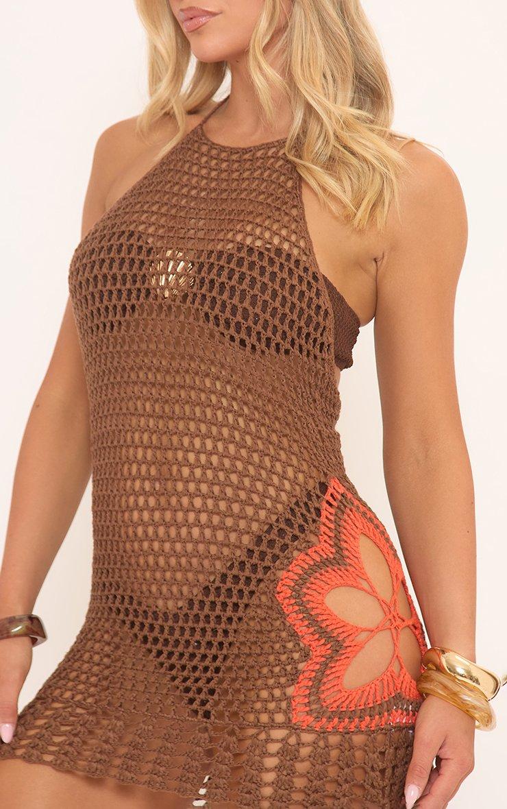 Halterneck Flower Detail Cut Out Mini Dress In Brown Crochet