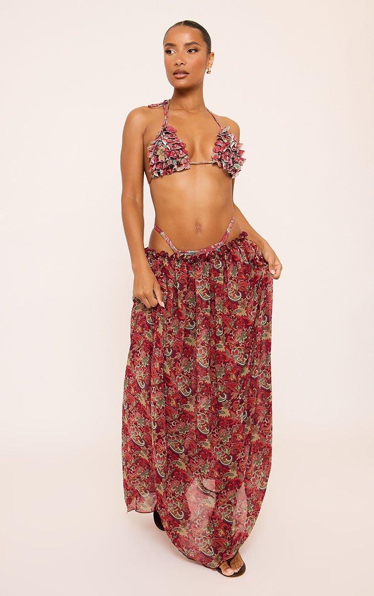 Ruffle Waist Maxi Skirt In Red Paisley Print Mesh