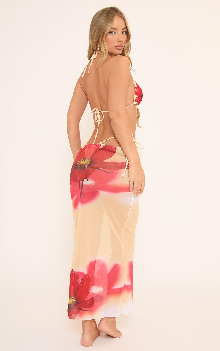 Flower Print Triangle Bikini Set And Low Waist Maxi Skirt 3 Piece Set In Yellow