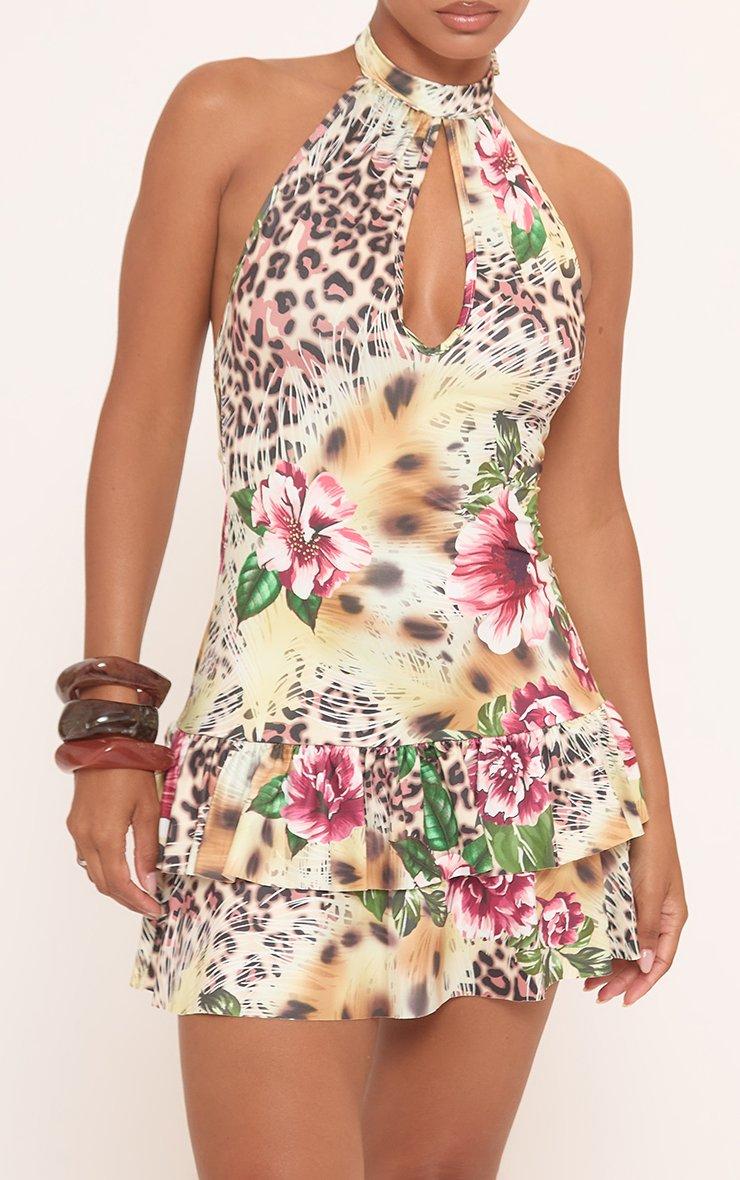 Halterneck Keyhole Cut Out Frilled Hem Mini Dress In Brown Abstract Print