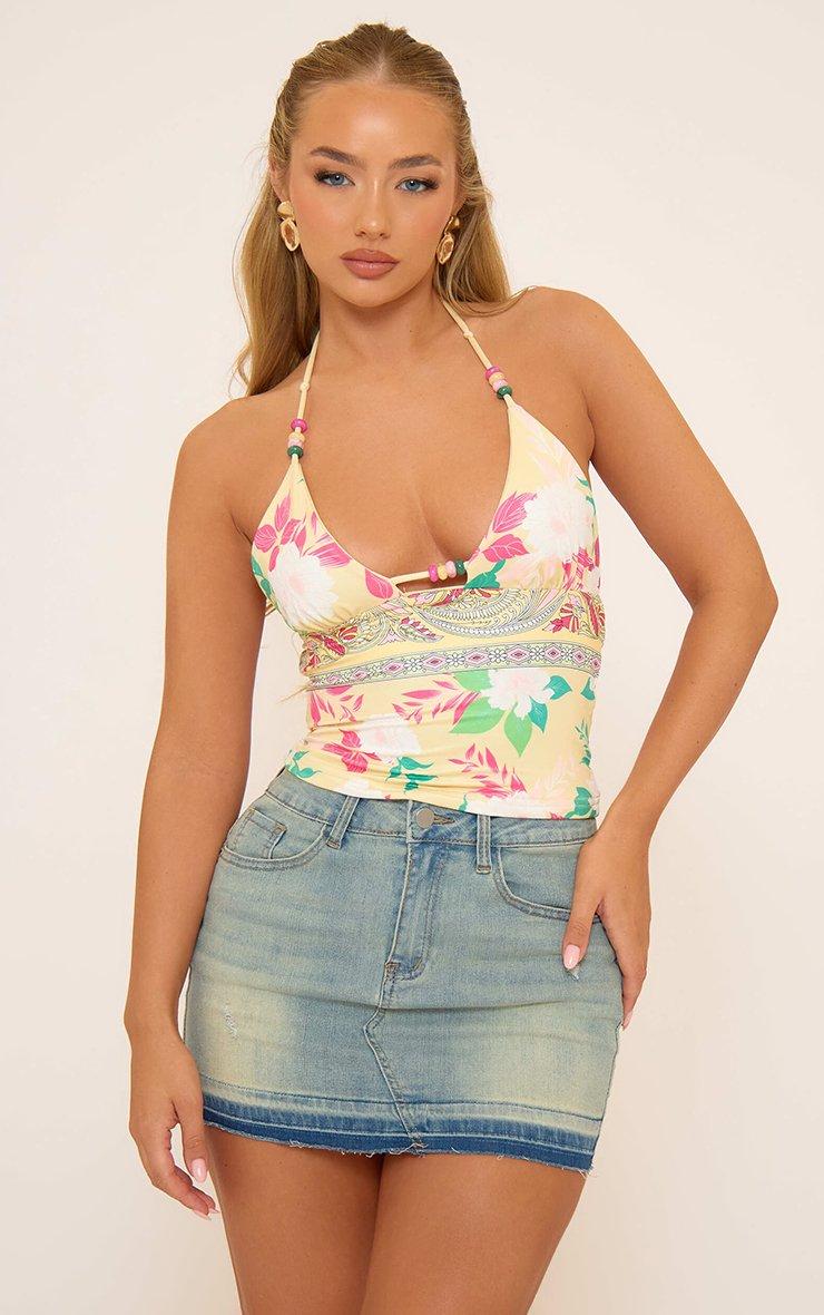 Halterneck Beaded Cami Top In Yellow Flower Printed