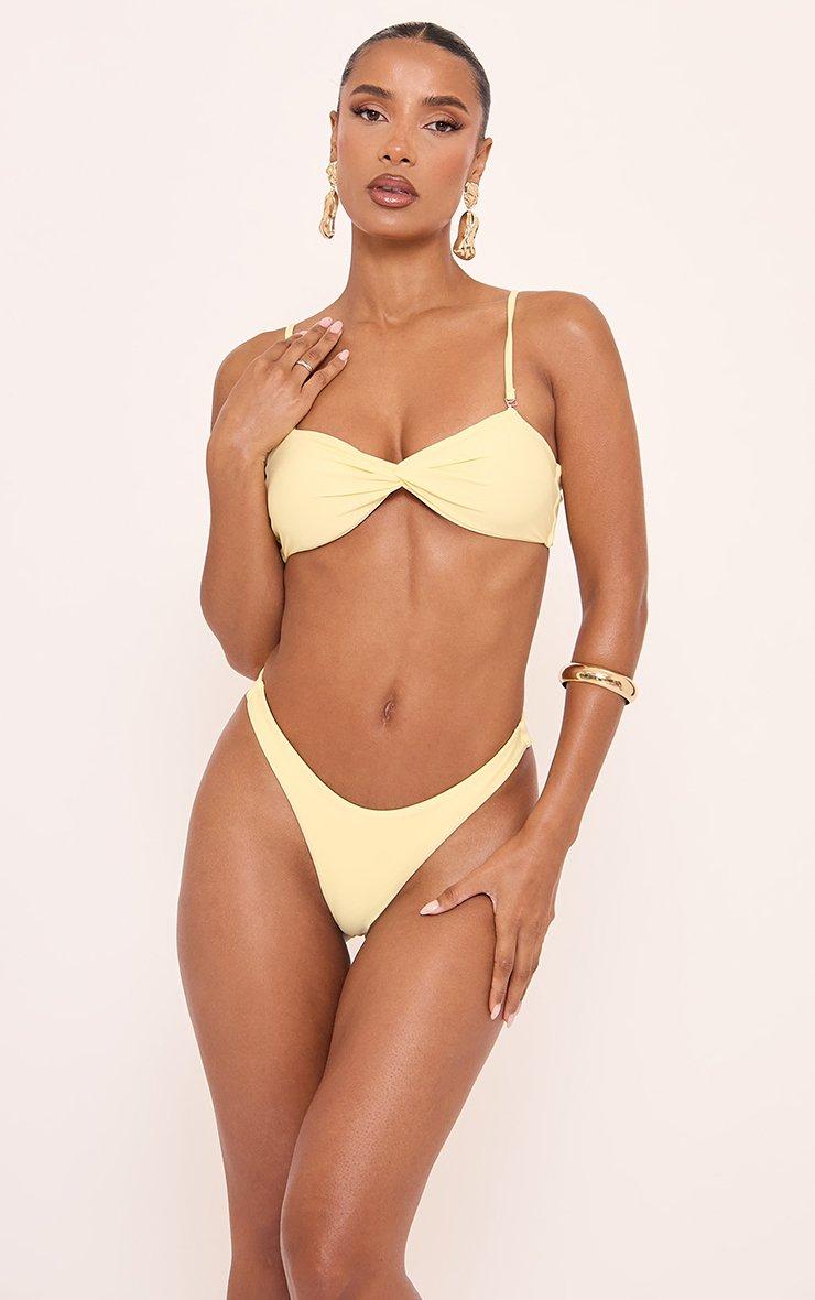 Sun’s out and you're glowing in this yellow bikini set, featuring a twist front bandeau with detachable straps and matching bottoms—made for poolside posing and vacay vibes, doll.