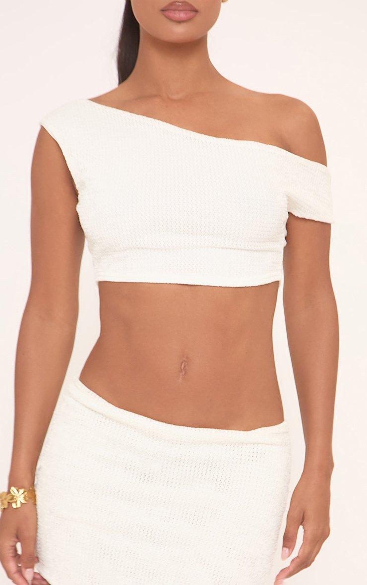 Soft but statement-making. Featuring a cream textured material with off the shoulder detailing in a cropped design, this top is your go-to for effortless style with a touch of glam.