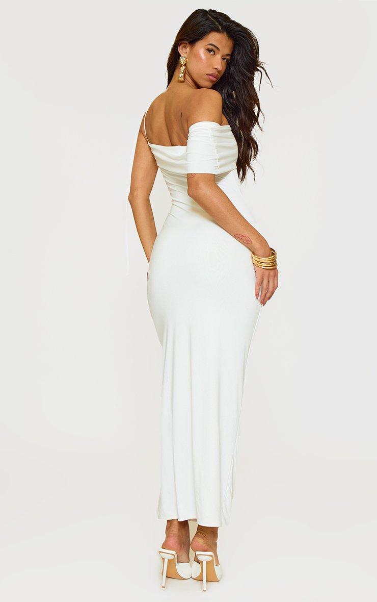 Off The Shoulder Beaded Trim Strap Detail Maxi Dress In White Slinky