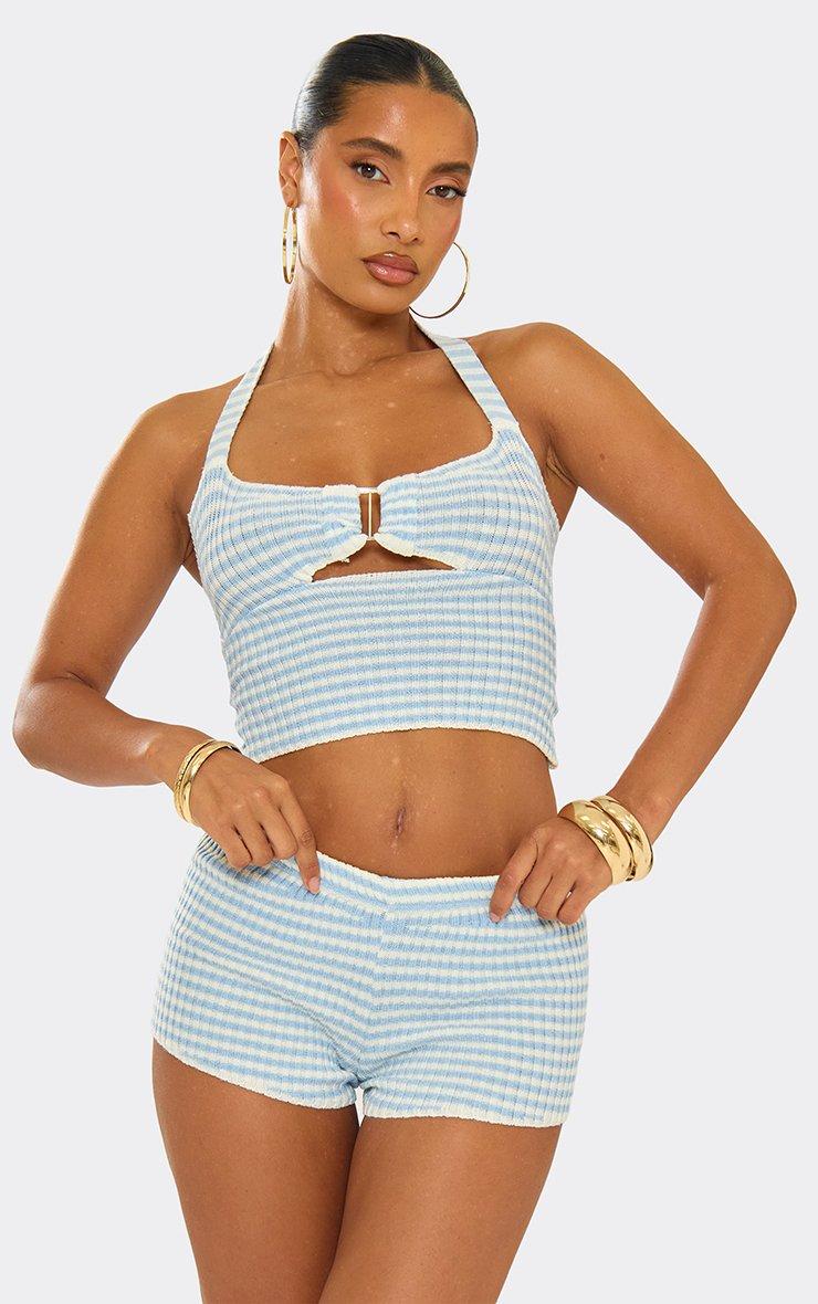 Serve cute and casual vibes, doll! Featuring baby blue stripe knit fabric with low-rise fit and soft stretch detailing, these shorts bring playful, chic energy perfect for laid-back sunny days.