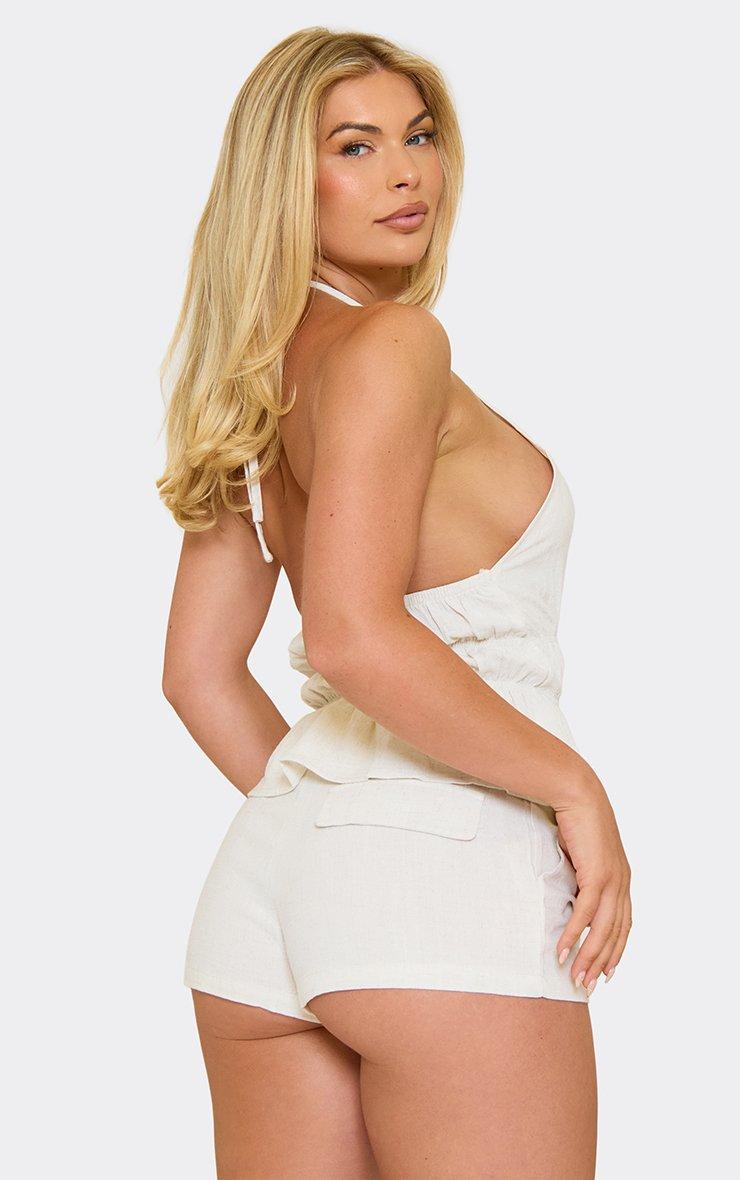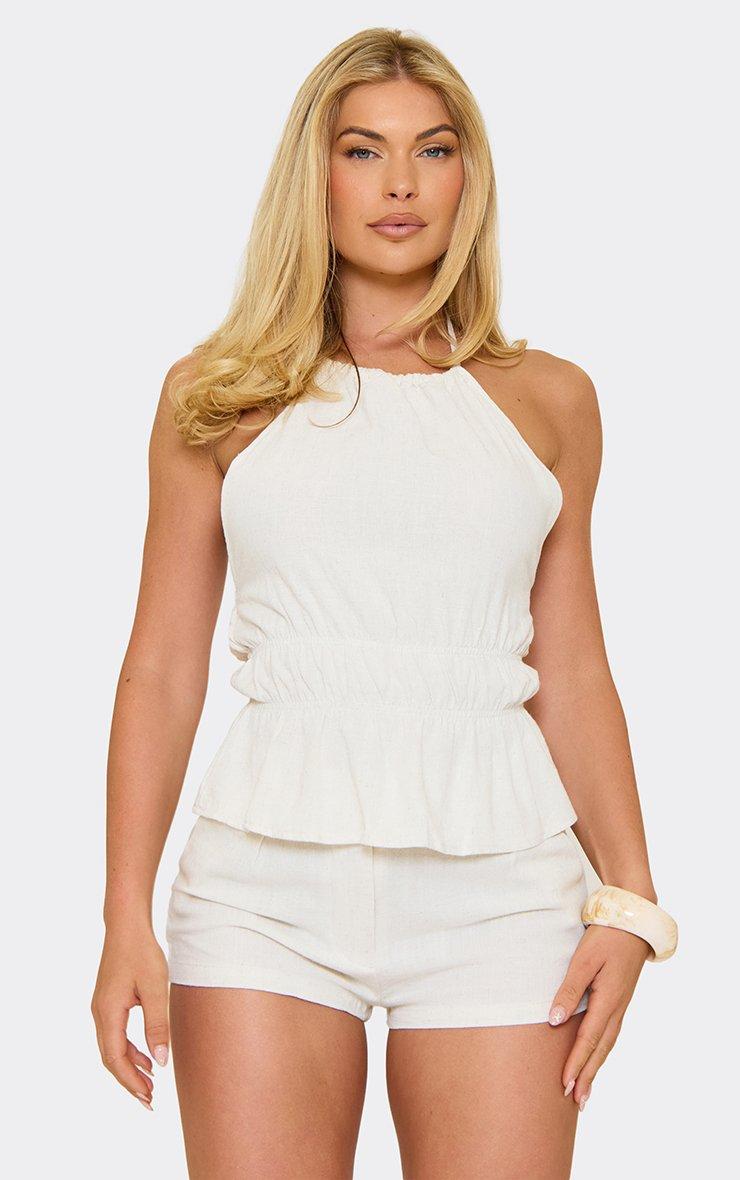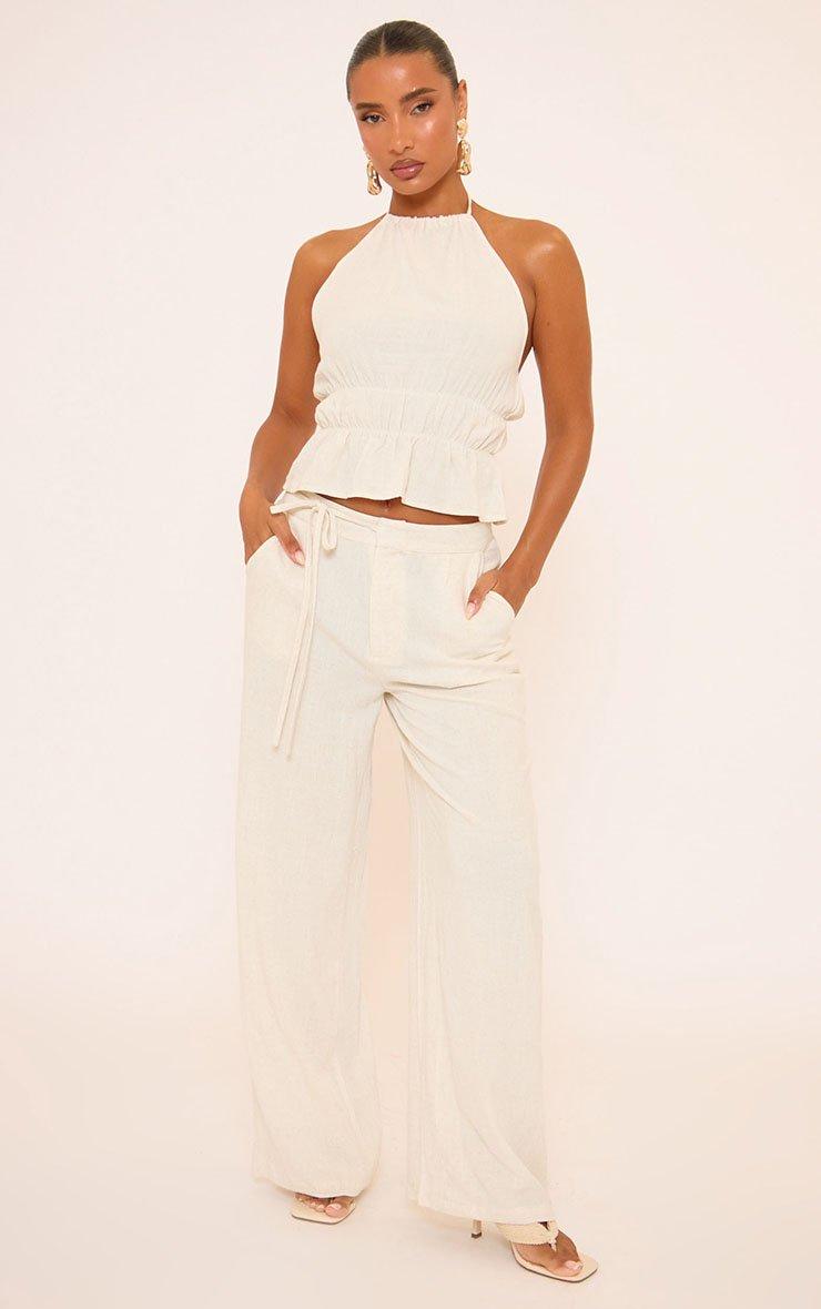 Halterneck Ruched Waist Detail Top In Stone Linen