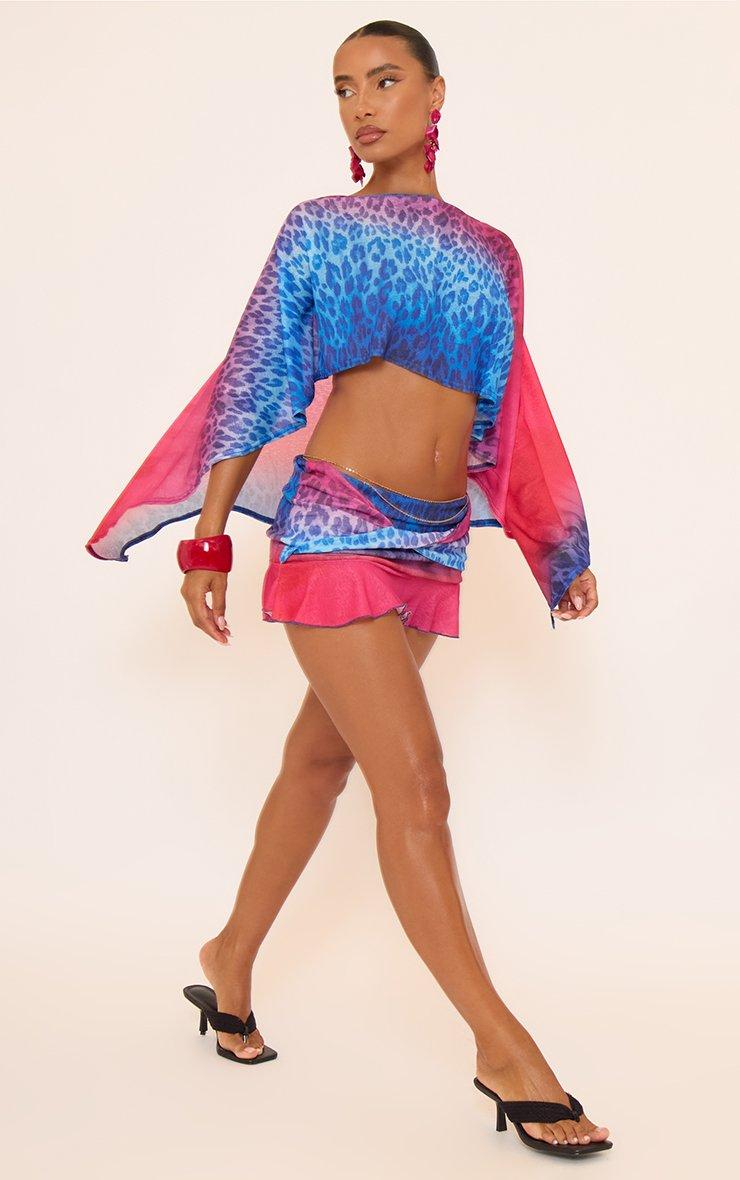 Mid Rise Frill Knot Detail Mini Skirt In Blue And Pink Leopard Print