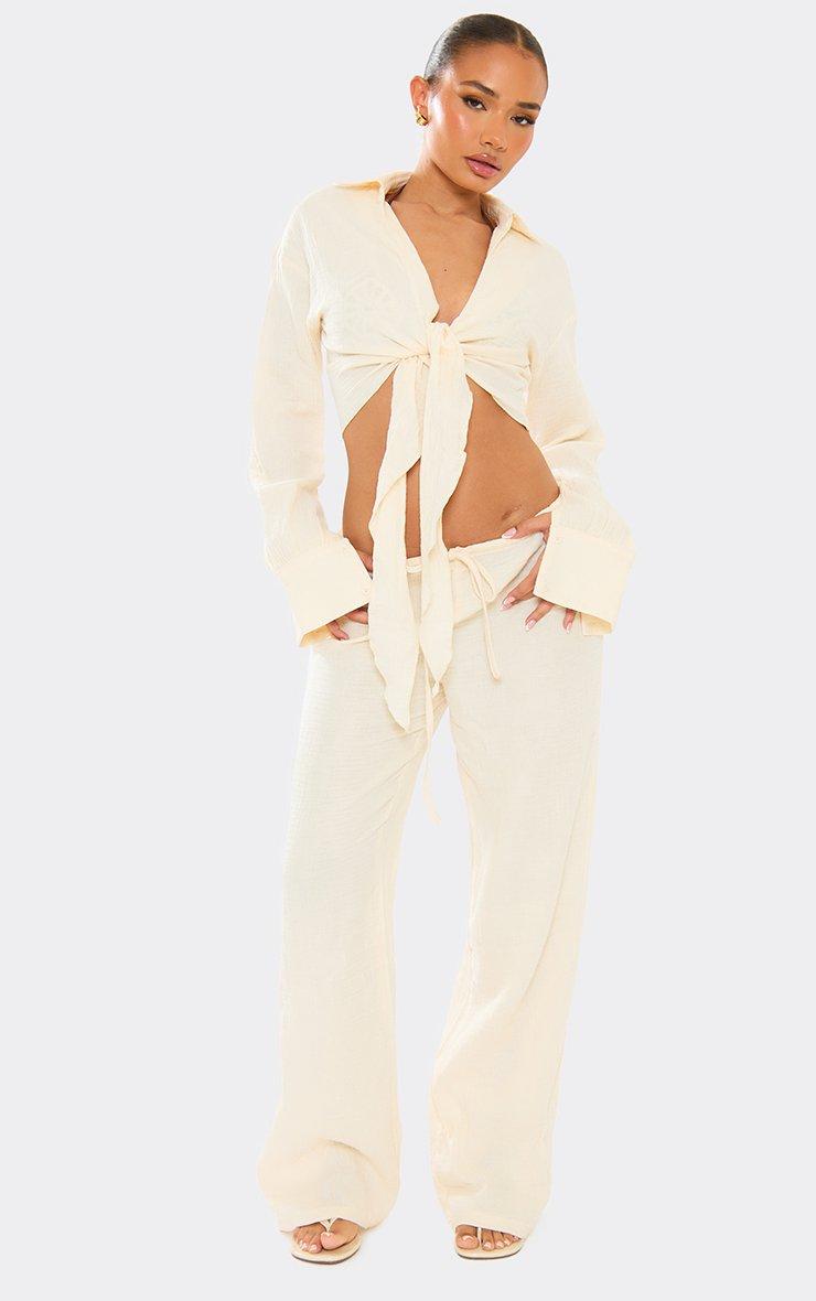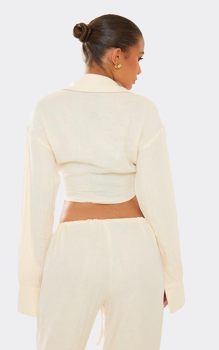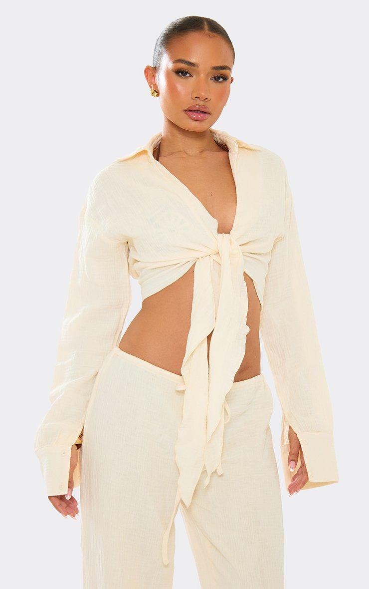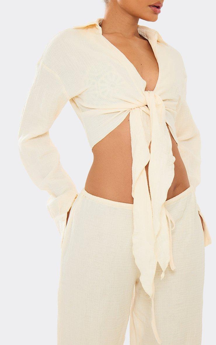 Serve laid-back chic, doll! Featuring cream cheesecloth fabric with long sleeves and tie front detailing, this crop shirt brings fresh, bold vibes perfect for effortless days and cool nights.