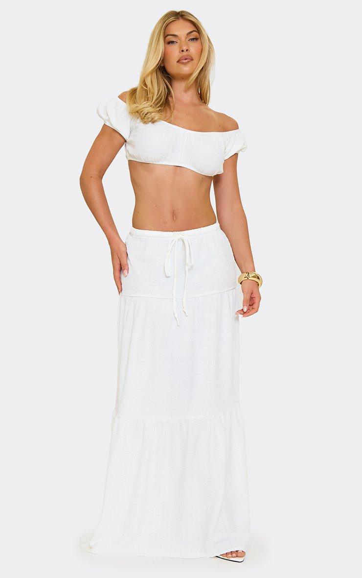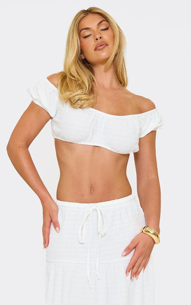 Perfect for sun-soaked days, doll! Featuring a white textured fabric with milkmaid-inspired detailing, this bardot crop top adds a sweet, fresh vibe to your summer line-up with its flattering off-shoulder shape.