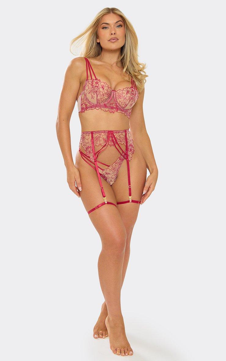Strap Detail Floral Lingerie 3 Piece Set In Red Lace