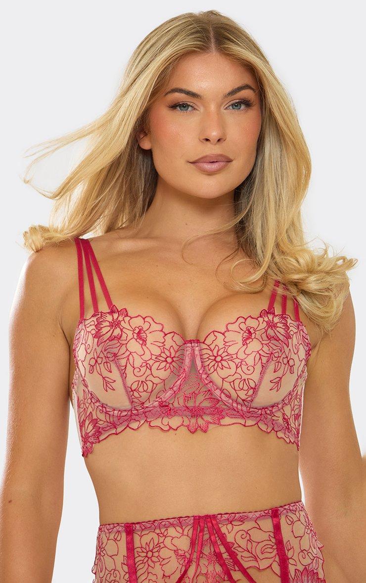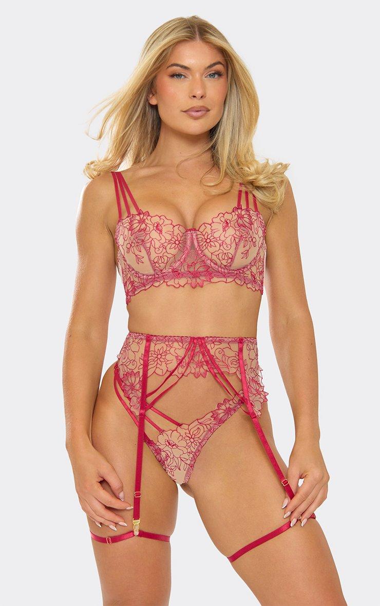 Valentine’s vibes every night, doll. Featuring a red lace material with floral detailing and strappy accents, this 3 piece lingerie set is bringing fiery energy straight to your lingerie drawer.