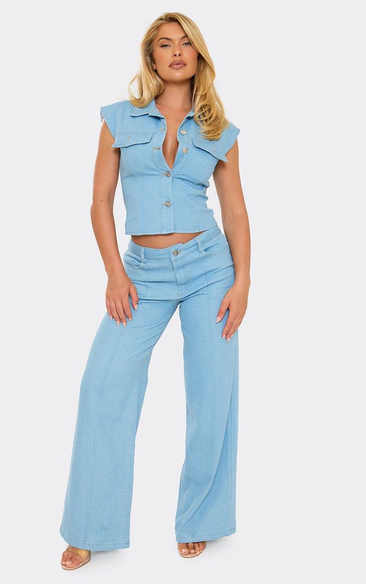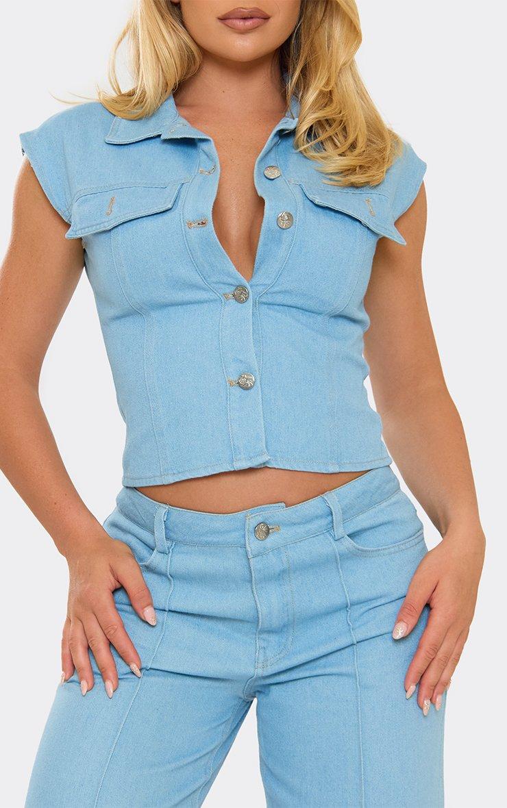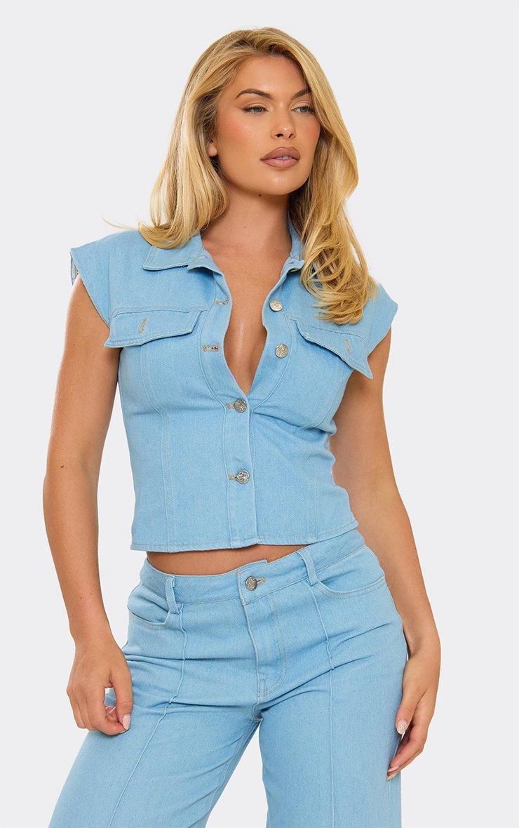 Cut from timeless blue denim, this cap sleeve collared button down top serves up a chic, laid-back edge with its structured design and clean lines, perfect for nailing that off-duty trend mood.