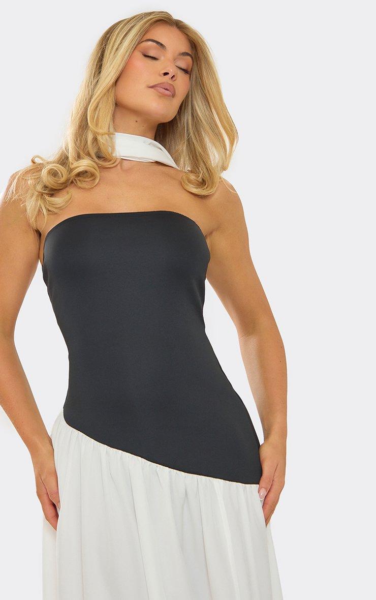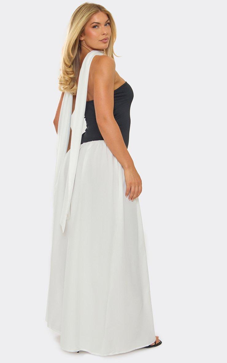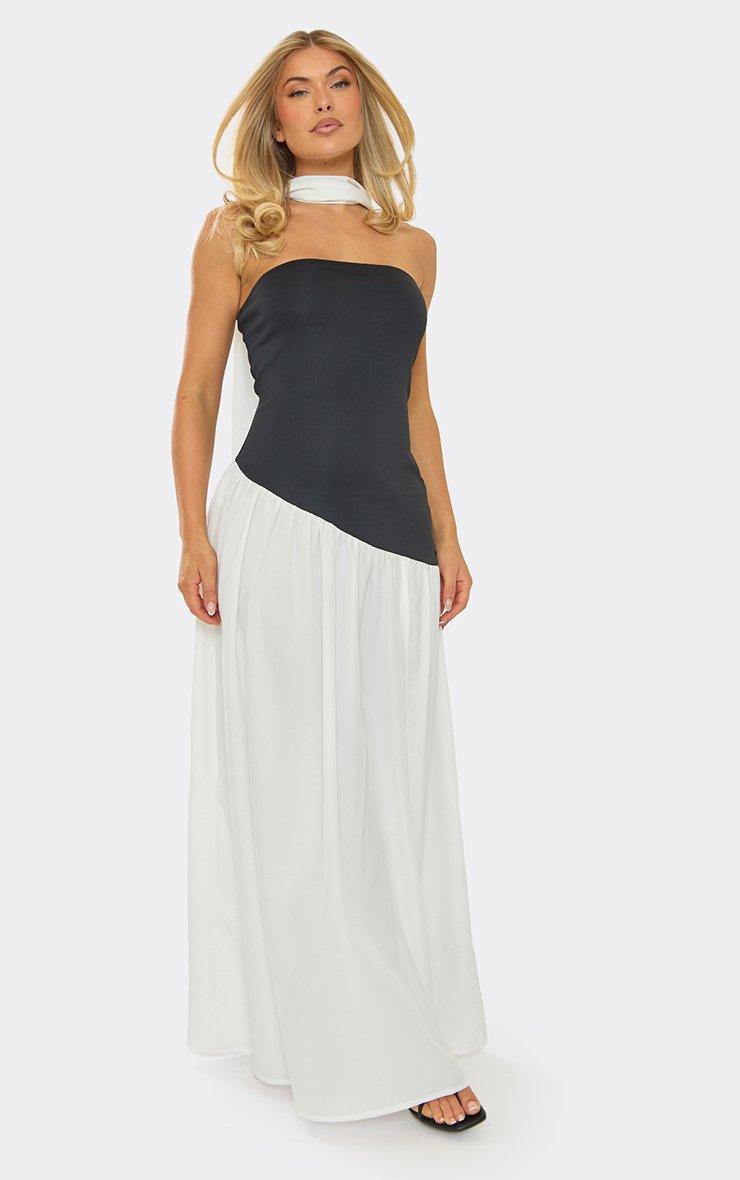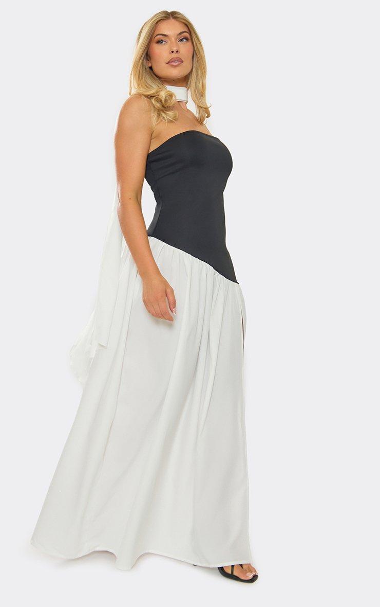 Night-out vibes, doll. Featuring a black material with scarf, contrast pleated hem and split leg detailing, this maxi dress is giving bold, chic energy for statement evening moments.