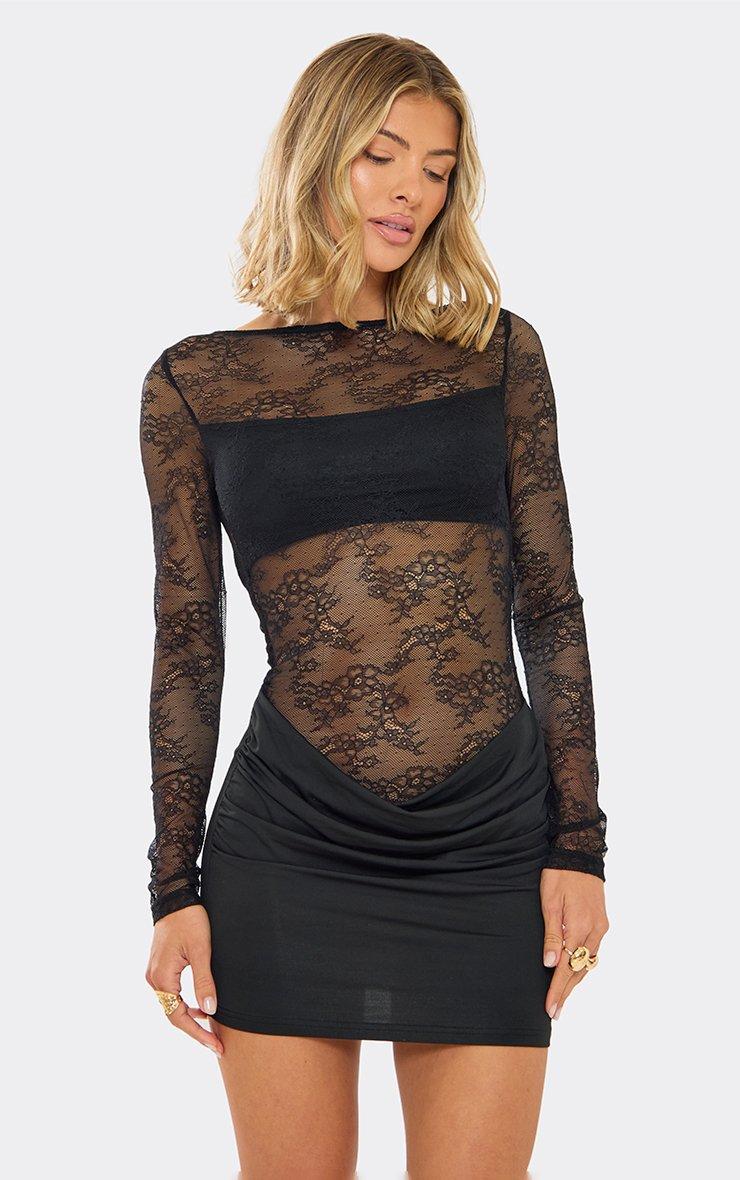 Long Sleeve Slash Neck Contrast Slinky Panel Detail Mini Dress In Black Lace