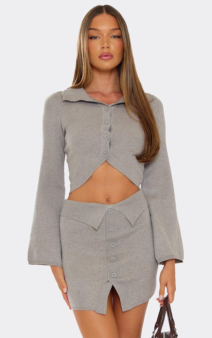 Weekend chic, doll. Featuring a grey compact knit material with flared sleeves, collared neckline, and button down detailing, this cropped cardigan is giving bold, stylish vibes for statement layering.