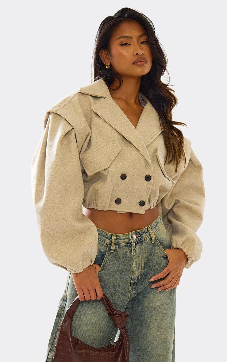 Autumn vibes, doll. Featuring a beige wool look material with cinched waist and long sleeve detailing, this cropped trench jacket is giving chic, bold energy for layered looks.