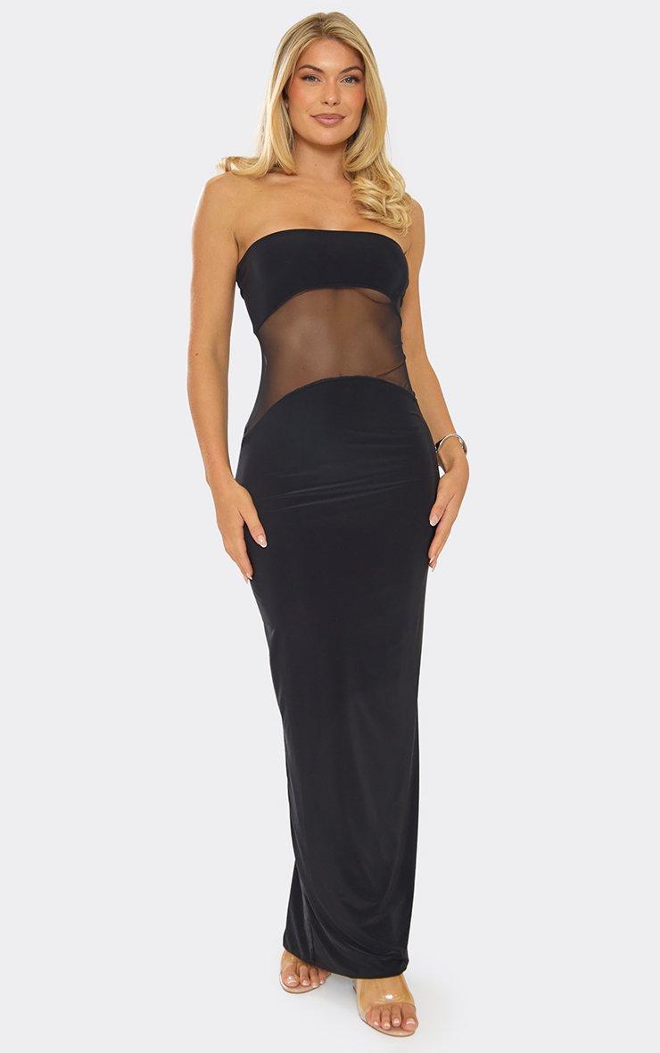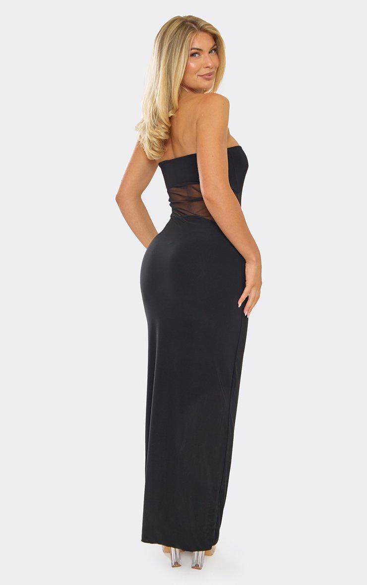 Night-out ready, doll. Featuring a black material with mesh insert detailing and bandeau design, this maxi dress is giving bold, chic vibes for statement moments.