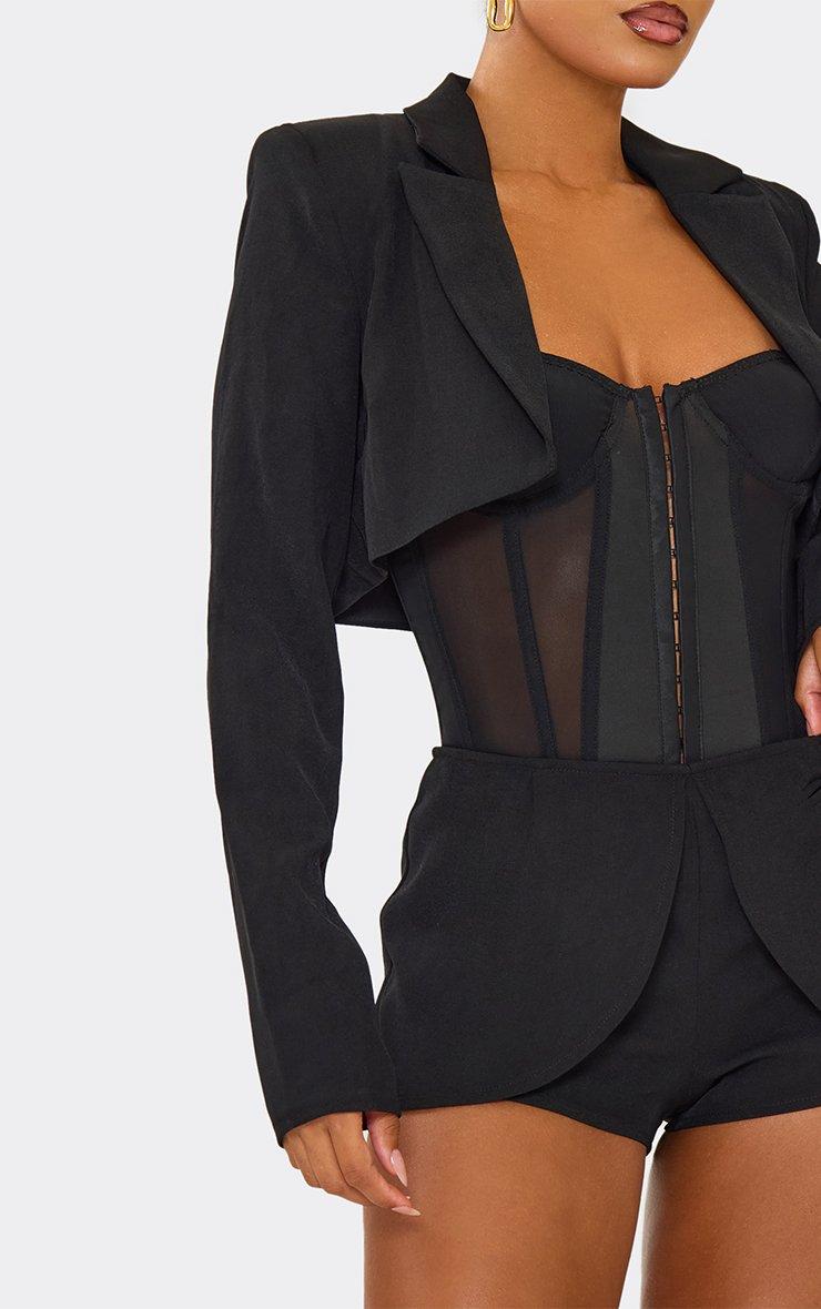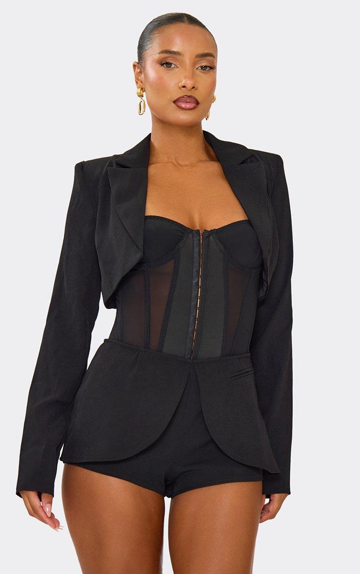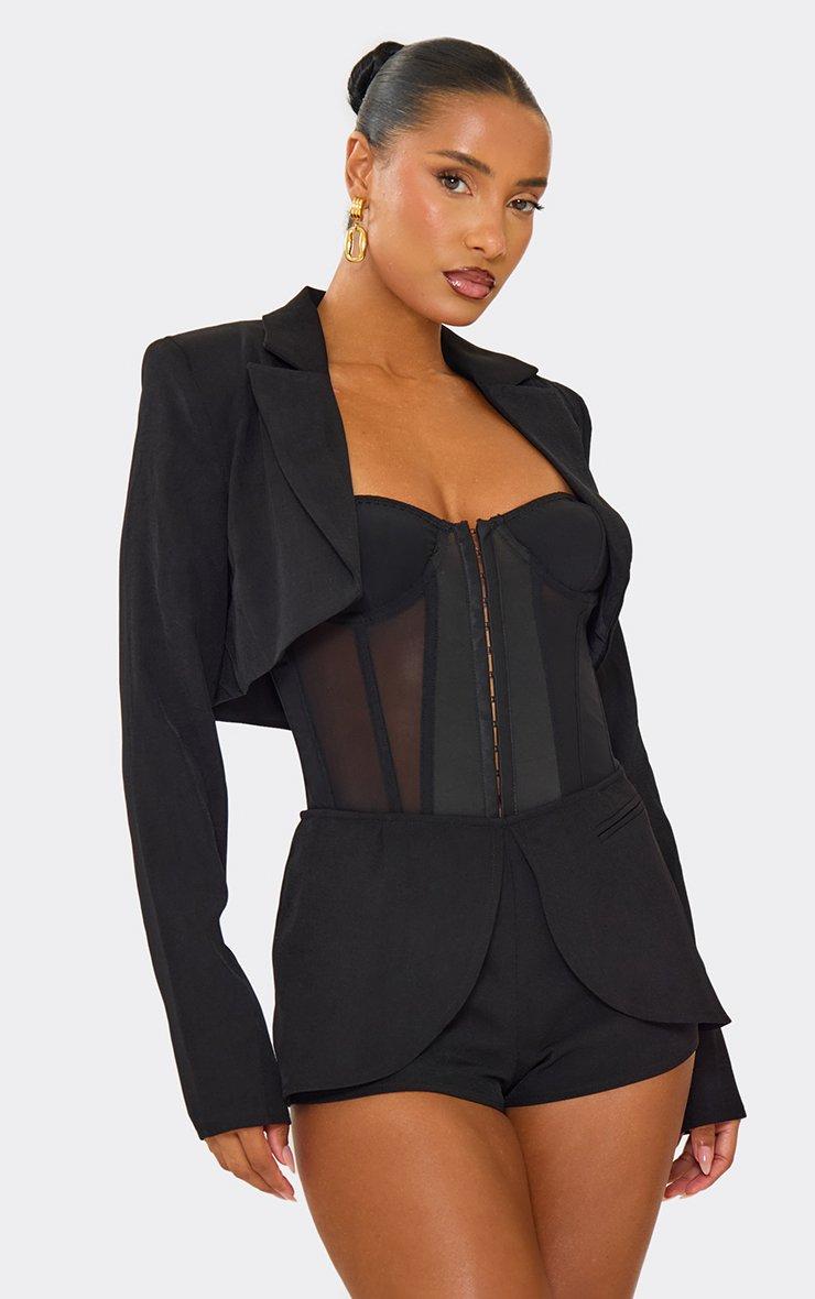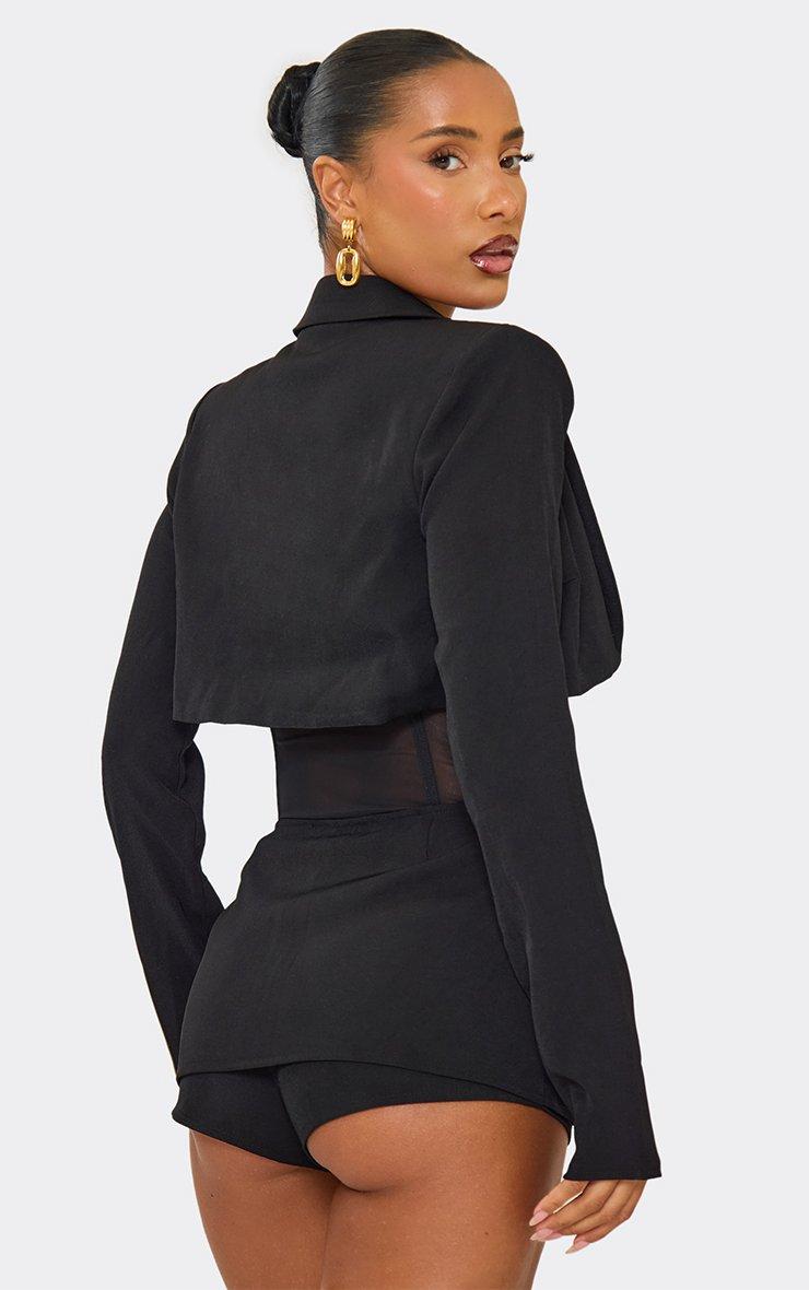 Why overthink your winter date night ideas when you can just wear this black mini blazer? A sleek statement-maker, this cropped blazer keeps the compliments coming with its sharp collar and long sleeves that add a tailored edge. Designed with a structured fit, it snatches and cinches at the waist and skims the shoulders. Pull out all the stops by styling this black mini blazer with some tailored shorts or a tiny mini skirt and some clear Perspex heels. This blazer is high key the fit.
