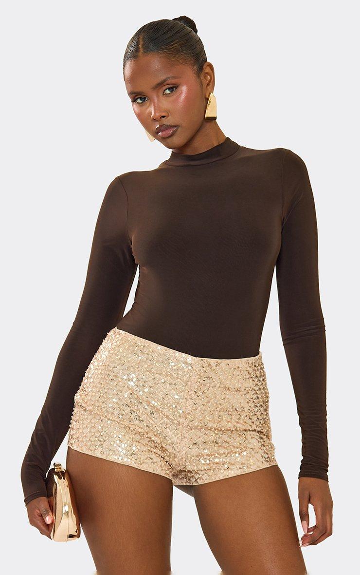 Add instant sparkle to your casual daytime looks with the gold sequin hot pants, a playful twist on everyday style. Perfect for day drink outfits, these micro hotpants are designed to catch the light and elevate even the simplest top-and-shoes combo. The mid-rise fit and shimmering gold sequins give you confidence and a subtle statement edge. Style the gold sequin hot pants with a crisp cami top , lace top , or a bandeau top , for a fun yet polished daytime ensemble. These hotpants make your day drink outfits feel effortlessly festive and chic. Key Features: Micro Length Gold Sequin Material Mid-Rise Waist Fitted Silhouette