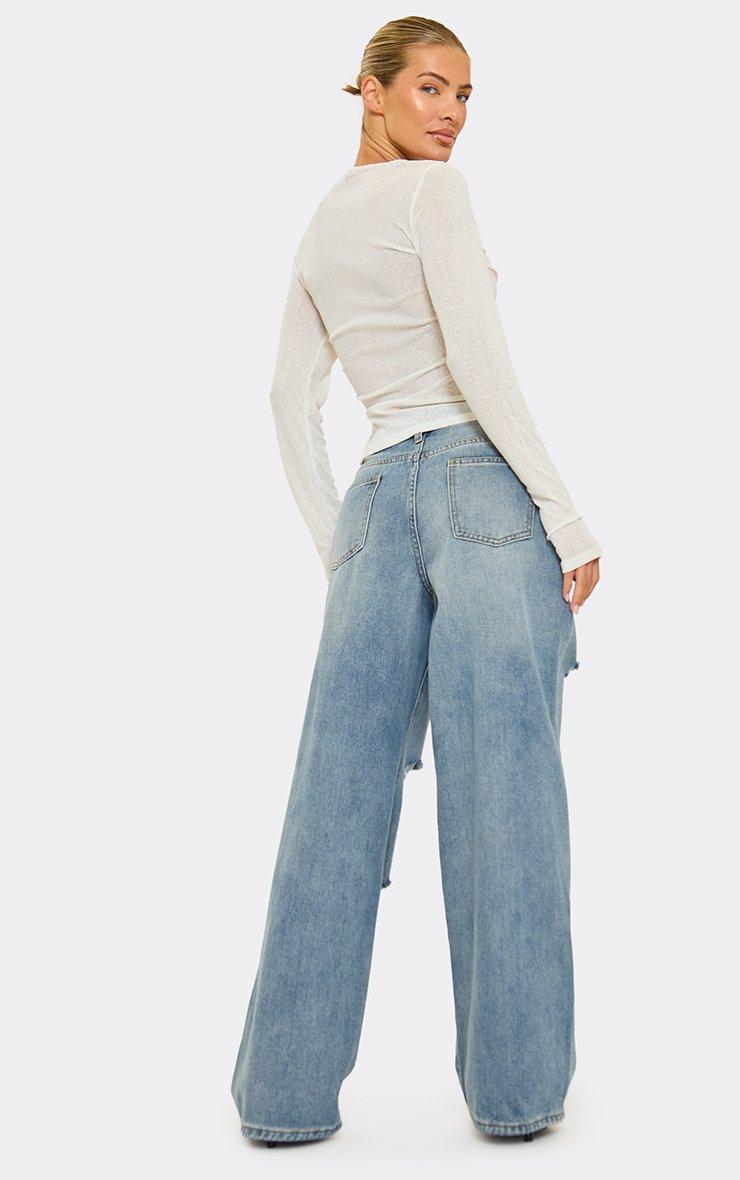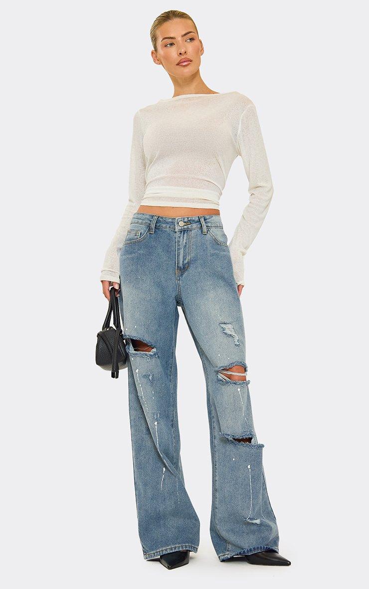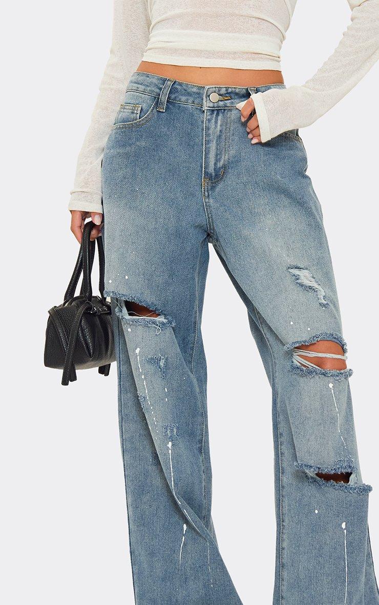 Stay effortlessly cool in these blue low rise wide leg jeans, perfect for casual day drink outfits or casual going out outfits. This blue low rise wide leg jeans style features a trendy paint splat and distressed detailing for a playful, street-style vibe. The low-rise waist and wide-leg cut create a flattering, relaxed fit that moves with you all day. Pair them with a cropped top or a fitted blouse for brunch with friends, or dress them up with heels and a blazer for an evening out. An essential wardrobe staple for those who love casual-chic denim with a statement edge. Key Features Blue Colour Denim Fabric Low-Rise Waist Wide-Leg Fit Distressed Design Paint Splat Detailing