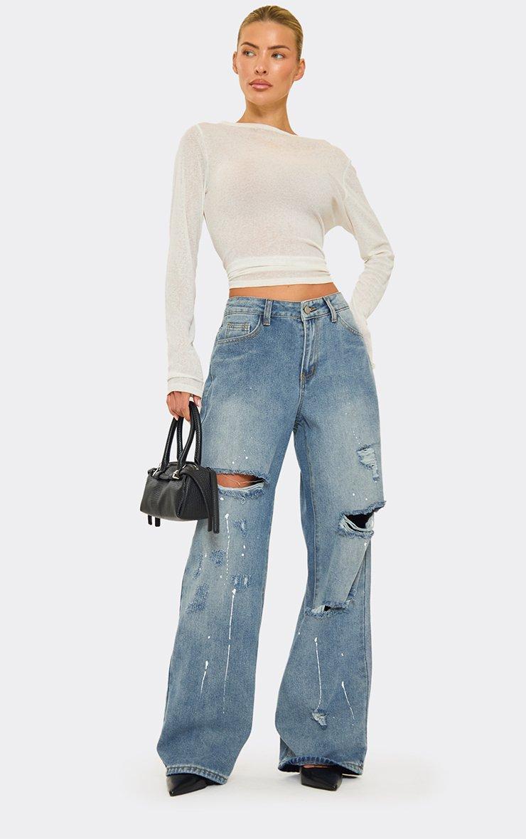 Low Rise Paint Splat Distressed Wide Leg Jeans In Blue Denim
