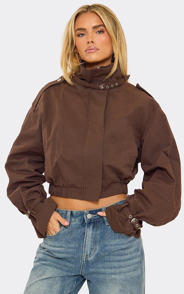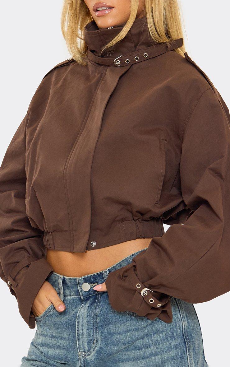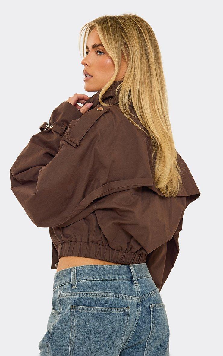 High Neck Strap Detail Cropped Trench Coat In Chocolate Brown