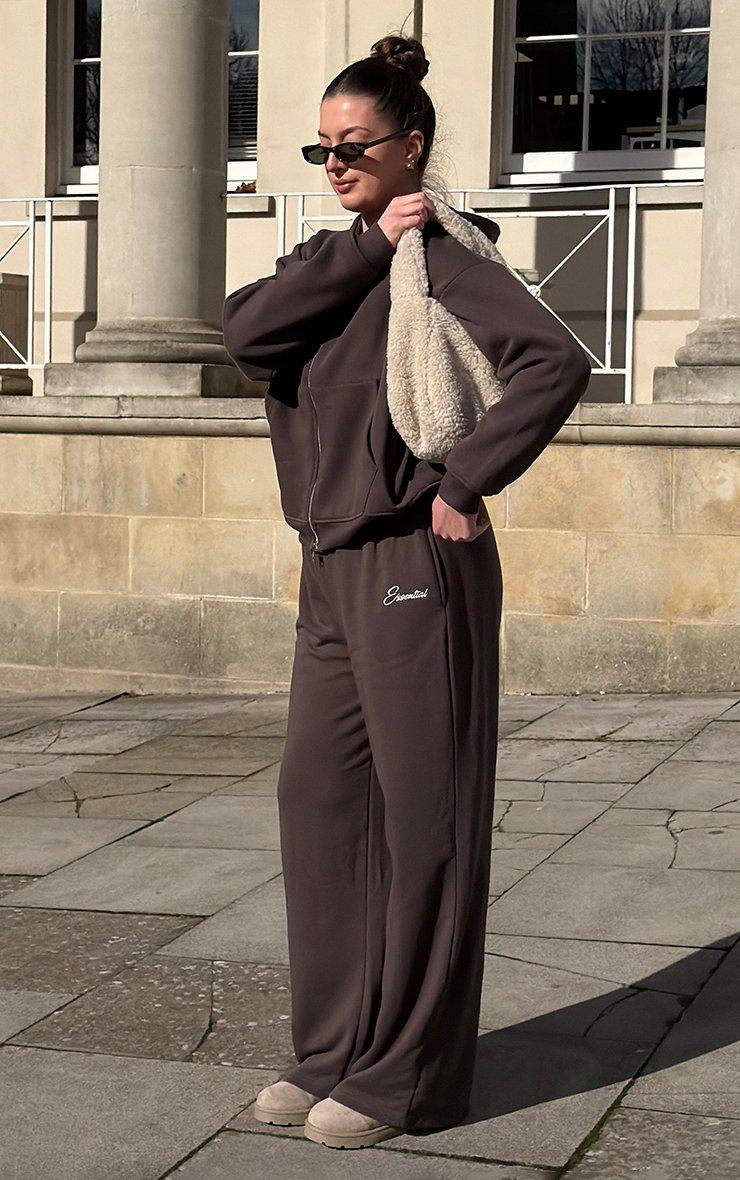 Mid Rise Essential Embroidered Graphic Wide Leg Joggers In Chocolate Brown