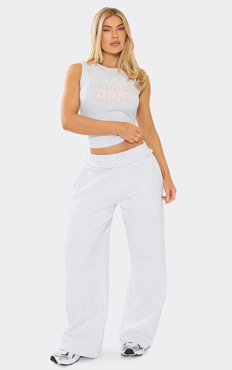 Perfect for off-duty or casual vibes, doll. Featuring grey material with low rise, distressed and J'Adore Dior graphic wide leg detailing, these joggers add cool, it-girl energy to any outfit. Style with a cropped top or hoodie and trainers for a boss-babe finish.
