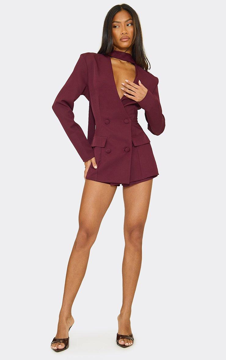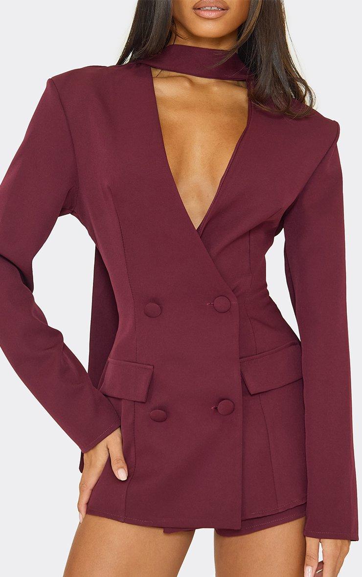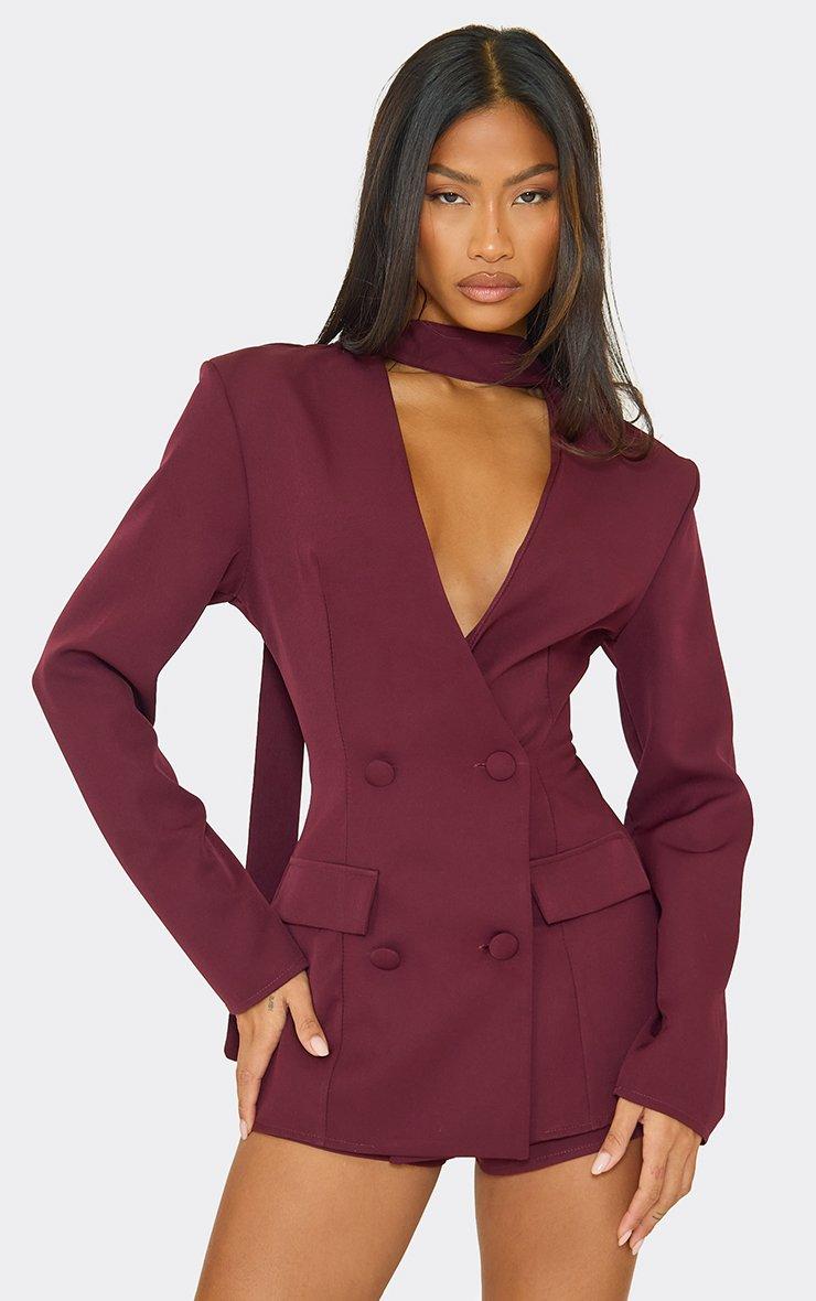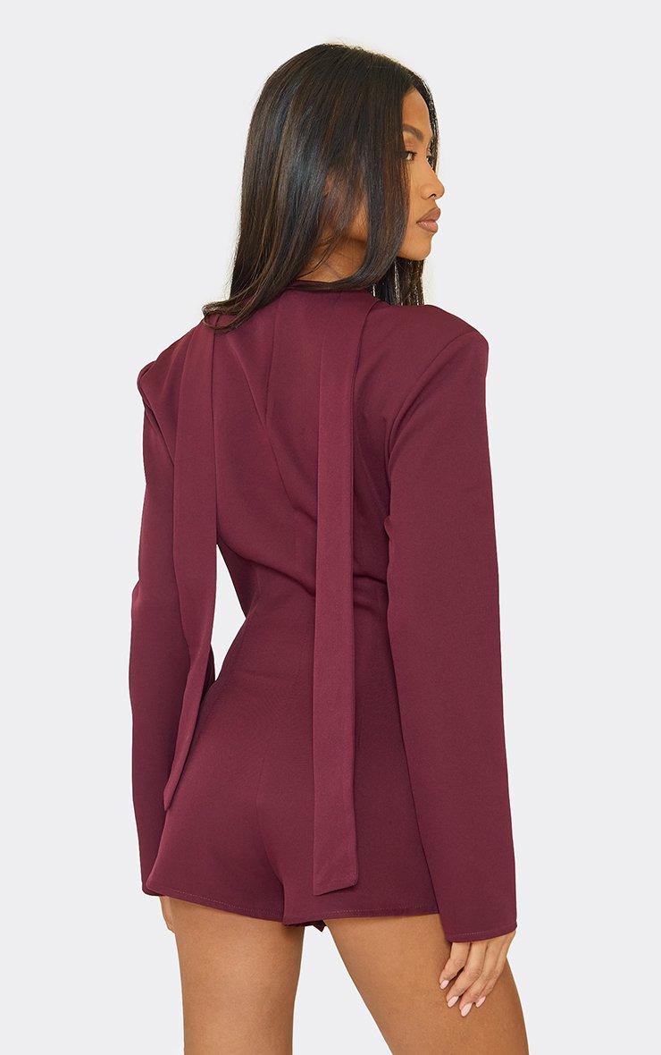 Tie Neck Plunge Blazer Detail Playsuit In Burgundy