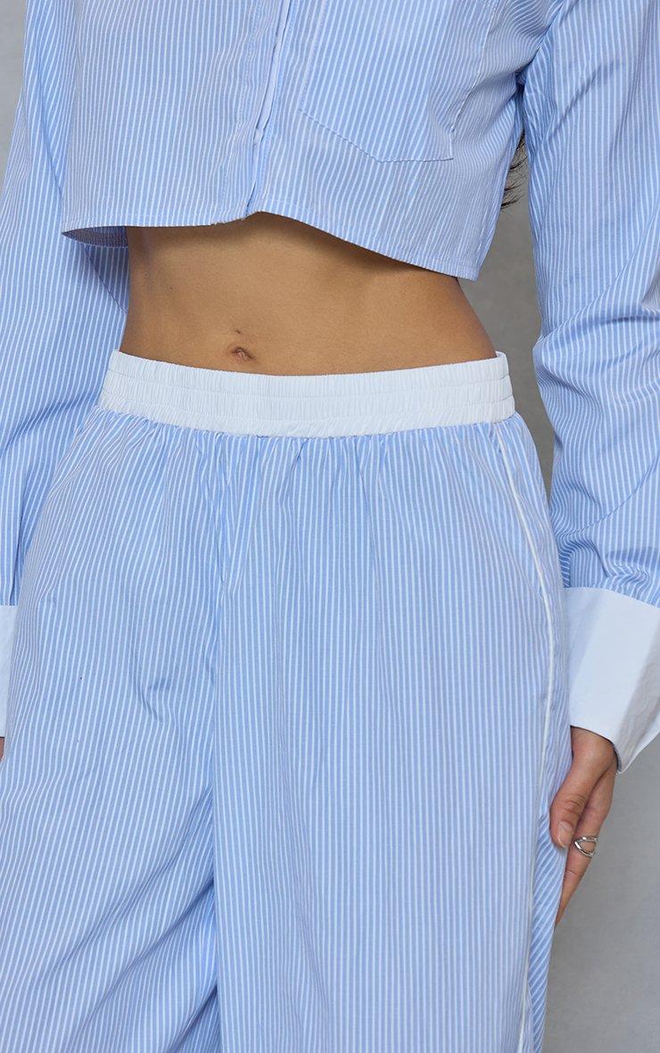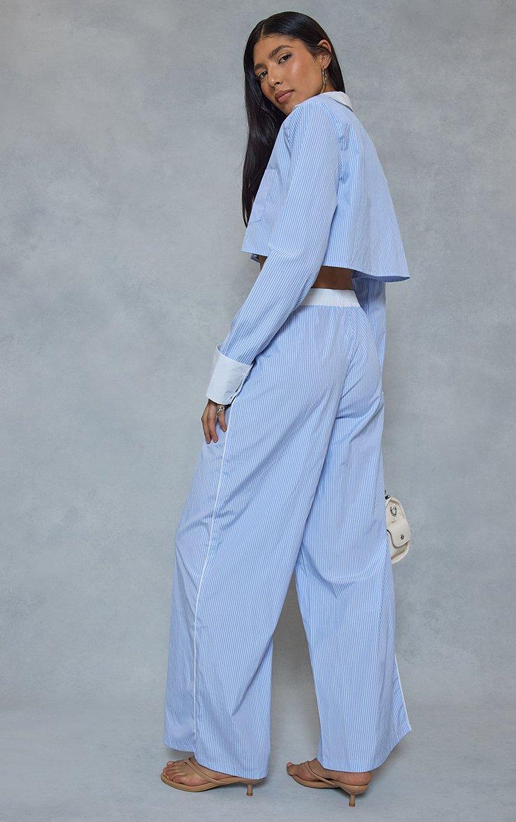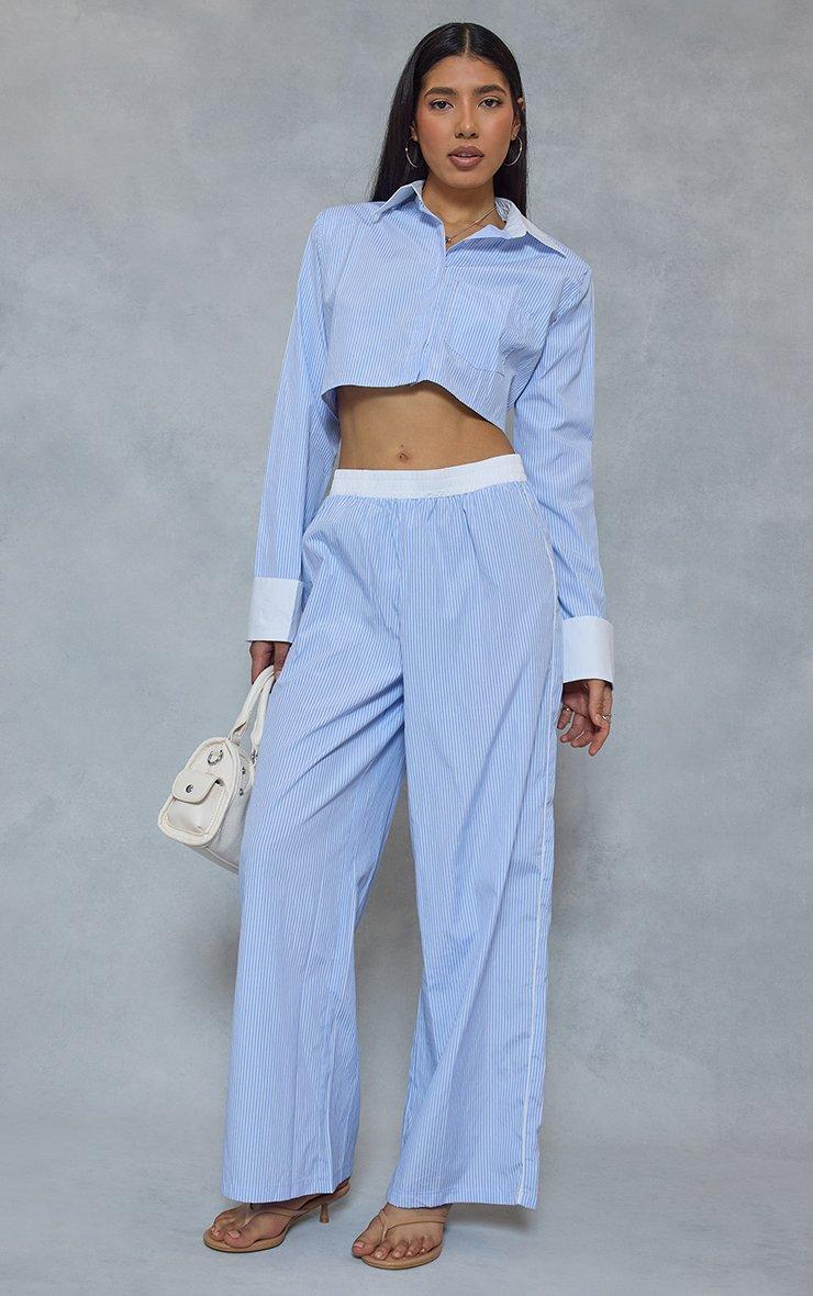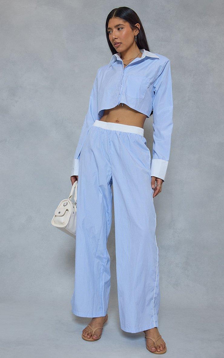 Switch up your wardrobe with these blue pinstripe trousers. Designed with a contrast waistband and straight-leg silhouette, these trousers combine classic tailoring with modern details for an elevated everyday look. If you’re exploring the different kinds of trousers, style these with a tucked-in shirt, blazer, and loafers for office-ready outfits, or dress them down with a cropped top and trainers for off-duty days. Add these blue pinstripe trousers to your rotation, a versatile piece for both work and weekend wardrobes.