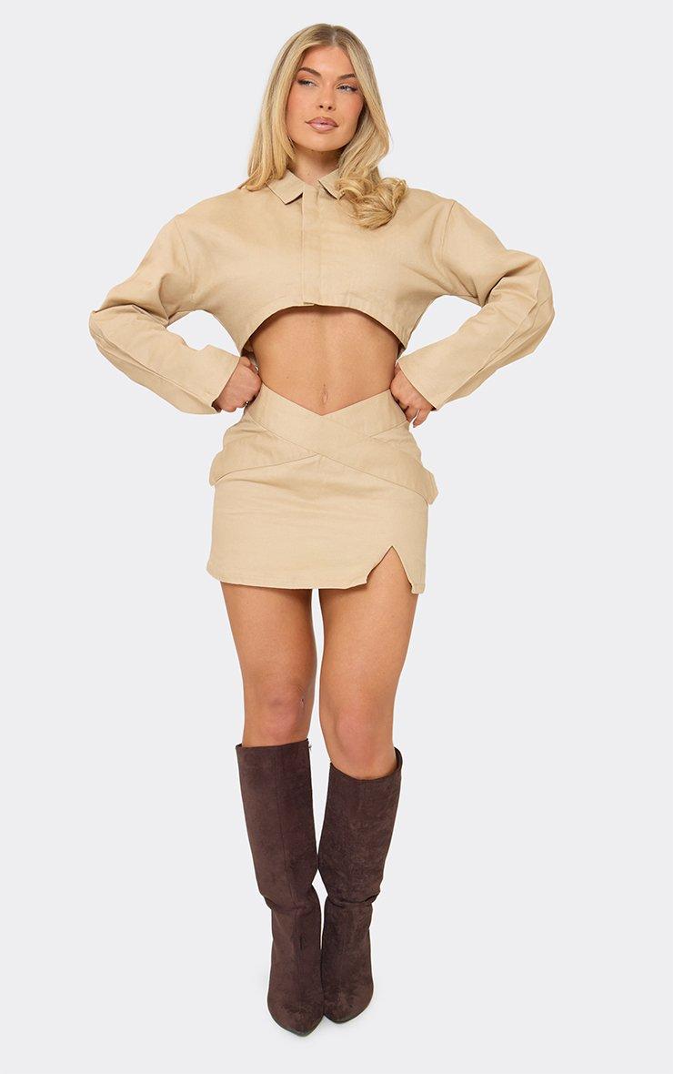 Get ready to serve major it-girl vibes. Featuring beige woven material with a dipped waist and split hem detailing. Style with a matching corset top and your go-to boots for a look that's totally on-trend.