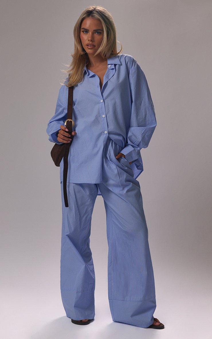 Drawstring Waist Wide Leg Poplin Trousers In Blue Stripe Crinkle